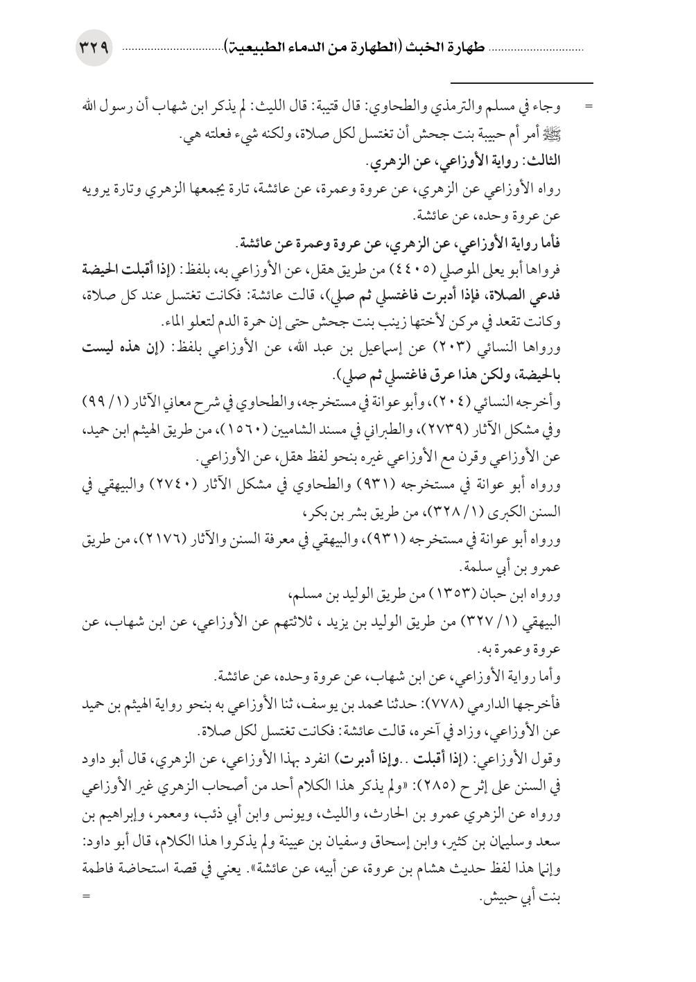 وقول الأوزاعي: (إذا أقبلت .. وإذا أدبرت) انفرد بهذا الأوزاعي، عن الزهري، قال أبو داود في السنن على إثر ح (٢٨٥): «ولم يذكر هذا الكلام أحد من أصحاب الزهري غير الأوزاعي ورواه عن الزهري عمرو بن الحارث، والليث، ويونس وابن أبي ذئب، ومعمر، وإبراهيم بن سعد وسليمان بن كثير، وابن إسحاق وسفيان بن عيينة ولم يذكروا هذا الكلام، قال أبو داود: وإنما هذا لفظ حديث هشام بن عروة، عن أبيه، عن عائشة». يعني في قصة استحاضة فاطمة بنت أبي حبيش. =