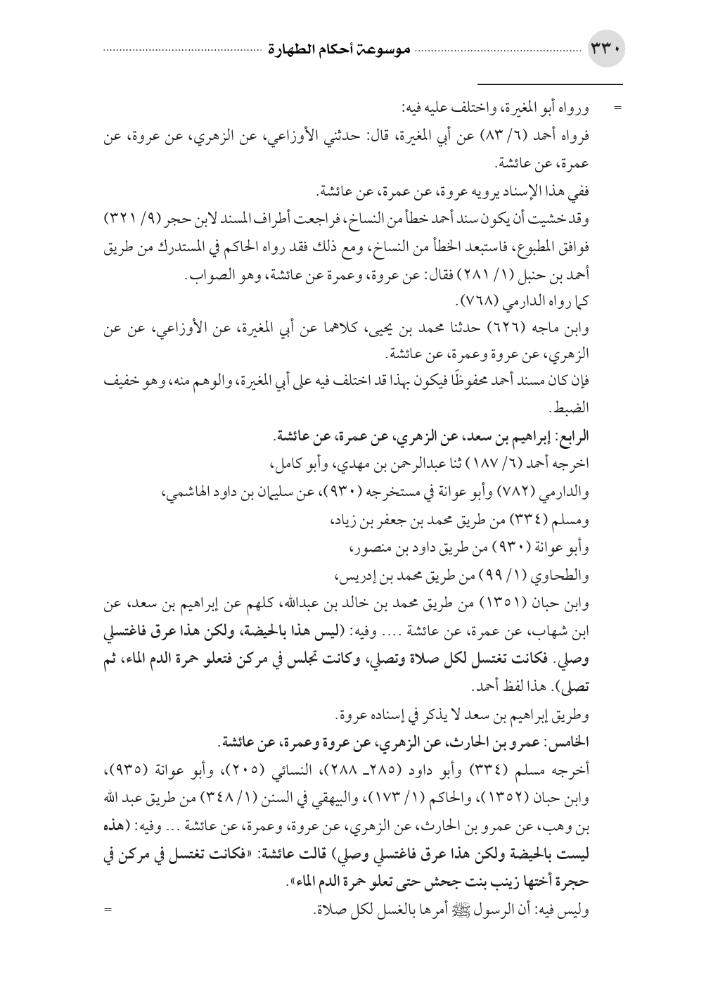 وابن حبان (١٣٥١) من طريق محمد بن خالد بن عبدالله، كلهم عن إبراهيم بن سعد، عن ابن شهاب، عن عمرة، عن عائشة .... وفيه: (ليس هذا بالحيضة، ولكن هذا عرق فاغتسلي وصلي. فكانت تغتسل لكل صلاة وتصلي، وكانت تجلس في مركن فتعلو حمرة الدم الماء، ثم تصلى). هذا لفظ أحمد.