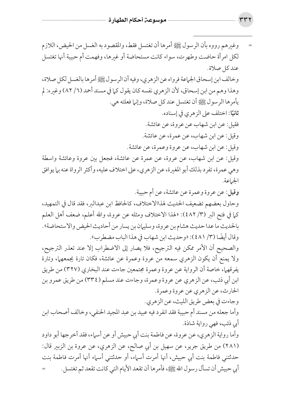 وخالف ابن إسحاق الجماعة فرواه عن الزهري، وفيه أن الرسول صلى الله عليه وسلم أمرها بالغسل لكل صلاة، وهذا وهم من ابن إسحاق، لأن الزهري نفسه كان يقول كما في مسند أحمد (٦/ ٨٢) وغيره: لم يأمرها الرسول صلى الله عليه وسلم أن تغتسل عند كل صلاة، وإنما فعلته هي.