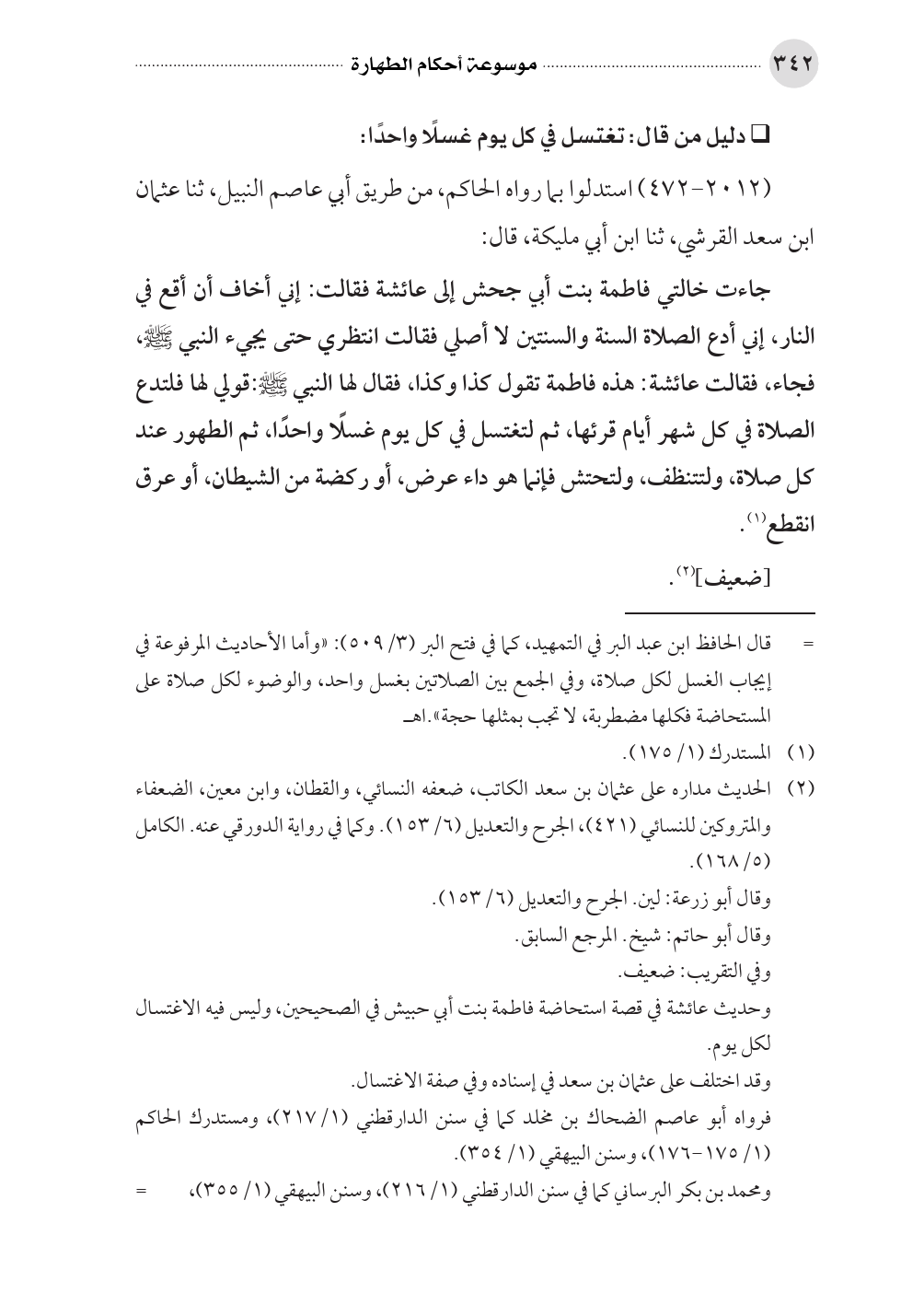 = قال الحافظ ابن عبد البر في التمهيد، كما في فتح البر (٣/ ٥٠٩): «وأما الأحاديث المرفوعة في إيجاب الغسل لكل صلاة، وفي الجمع بين الصلاتين بغسل واحد، والوضوء لكل صلاة على المستحاضة فكلها مضطربة، لا تجب بمثلها حجة».اهـ