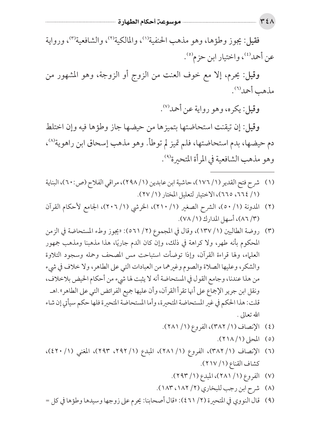 (¬٣) روضة الطالبين (١/ ١٣٧)، وقال في المجموع (٢/ ٥٦١): «يجوز وطء المستحاضة في الزمن المحكوم بأنه طهر، ولا كراهة في ذلك، وإن كان الدم جاريًا، هذا مذهبنا ومذهب جمهور العلماء، ولها قراءة القرآن، وإذا توضأت استباحت مس المصحف وحمله وسجود التلاوة والشكر، وعليها الصلاة والصوم وغيرهما من العبادات التي على الطاهر، ولا خلاف في شيء من هذا عندنا، وجامع القول في المستحاضة أنه لا يثبت لها شيء من أحكام الحيض بلاخلاف، ونقل ابن جرير الإجماع على أنها تقرأ القرآن، وأن عليها جميع الفرائض التي على الطاهر».اهـ