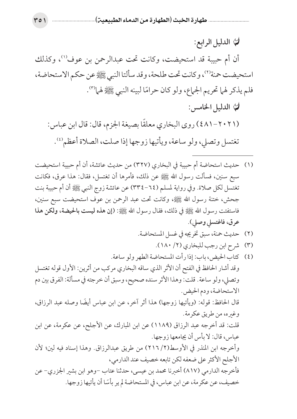 (¬١) حديث استحاضة أم حبيبة في البخاري (٣٢٧) من حديث عائشة، أن أم حبيبة استحيضت سبع سنين، فسألت رسول الله صلى الله عليه وسلم عن ذلك، فأمرها أن تغتسل، فقال: هذا عرق، فكانت تغتسل لكل صلاة. وفي رواية لمسلم (٦٤ - ٣٣٤) عن عائشة زوج النبي صلى الله عليه وسلم أن أم حبيبة بنت جحش، ختنة رسول الله صلى الله عليه وسلم، وكانت تحت عبد الرحمن بن عوف استحيضت سبع سنين، فاستفتت رسول الله صلى الله عليه وسلم في ذلك، فقال رسول الله صلى الله عليه وسلم: (إن هذه ليست بالحيضة، ولكن هذا عرق، فاغتسلي وصلي).