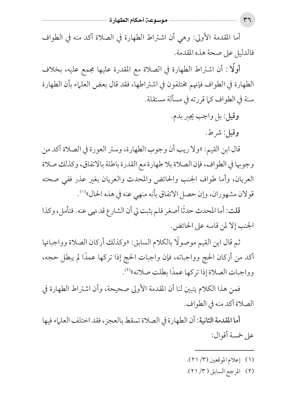 قال ابن القيم: «ولا ريب أن وجوب الطهارة، وستر العورة في الصلاة آكد من وجوبها في الطواف، فإن الصلاة بلا طهارة مع القدرة باطلة بالاتفاق، وكذلك صلاة العريان، وأما طواف الجنب والحائض والمحدث والعريان بغير عذر ففي صحته قولان مشهوران، وإن حصل الاتفاق بأنه منهي عنه في هذه الحال» (¬١).