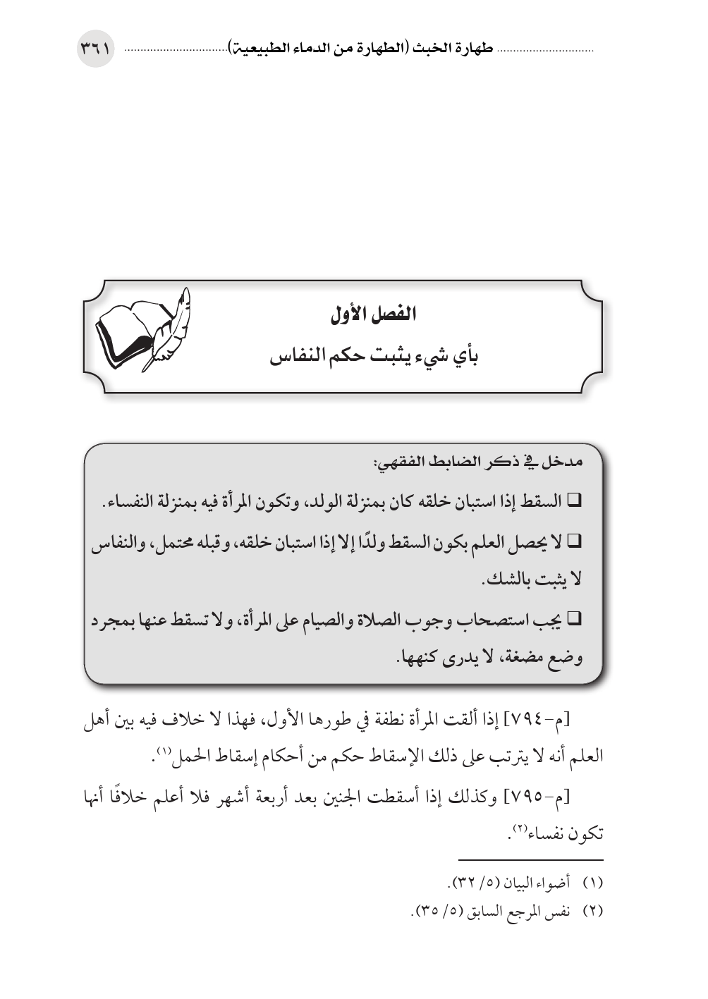 • لا يحصل العلم بكون السقط ولدًا إلا إذا استبان خلقه، وقبله محتمل، والنفاس لا يثبت بالشك.