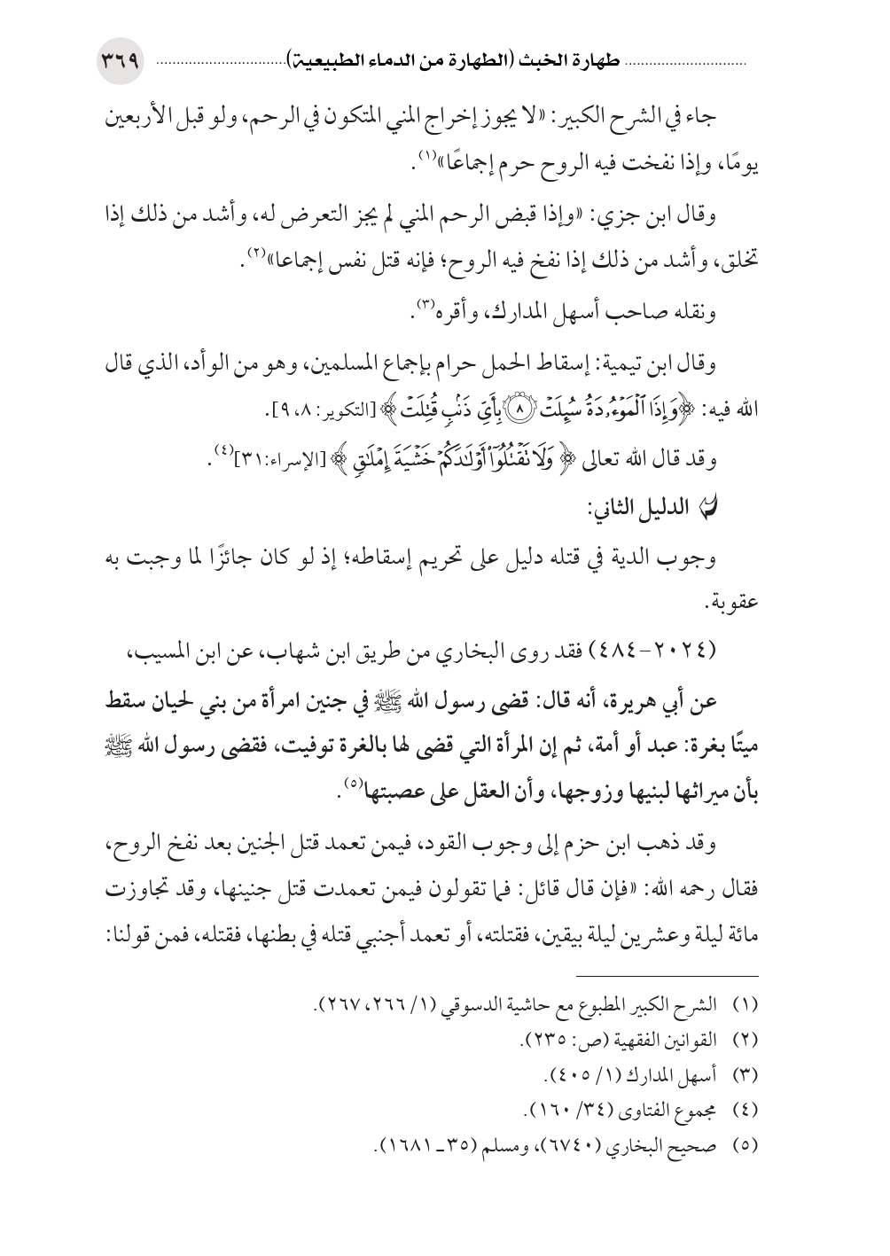جاء في الشرح الكبير: «لا يجوز إخراج المني المتكون في الرحم، ولو قبل الأربعين يومًا، وإذا نفخت فيه الروح حرم إجماعًا» (¬١).