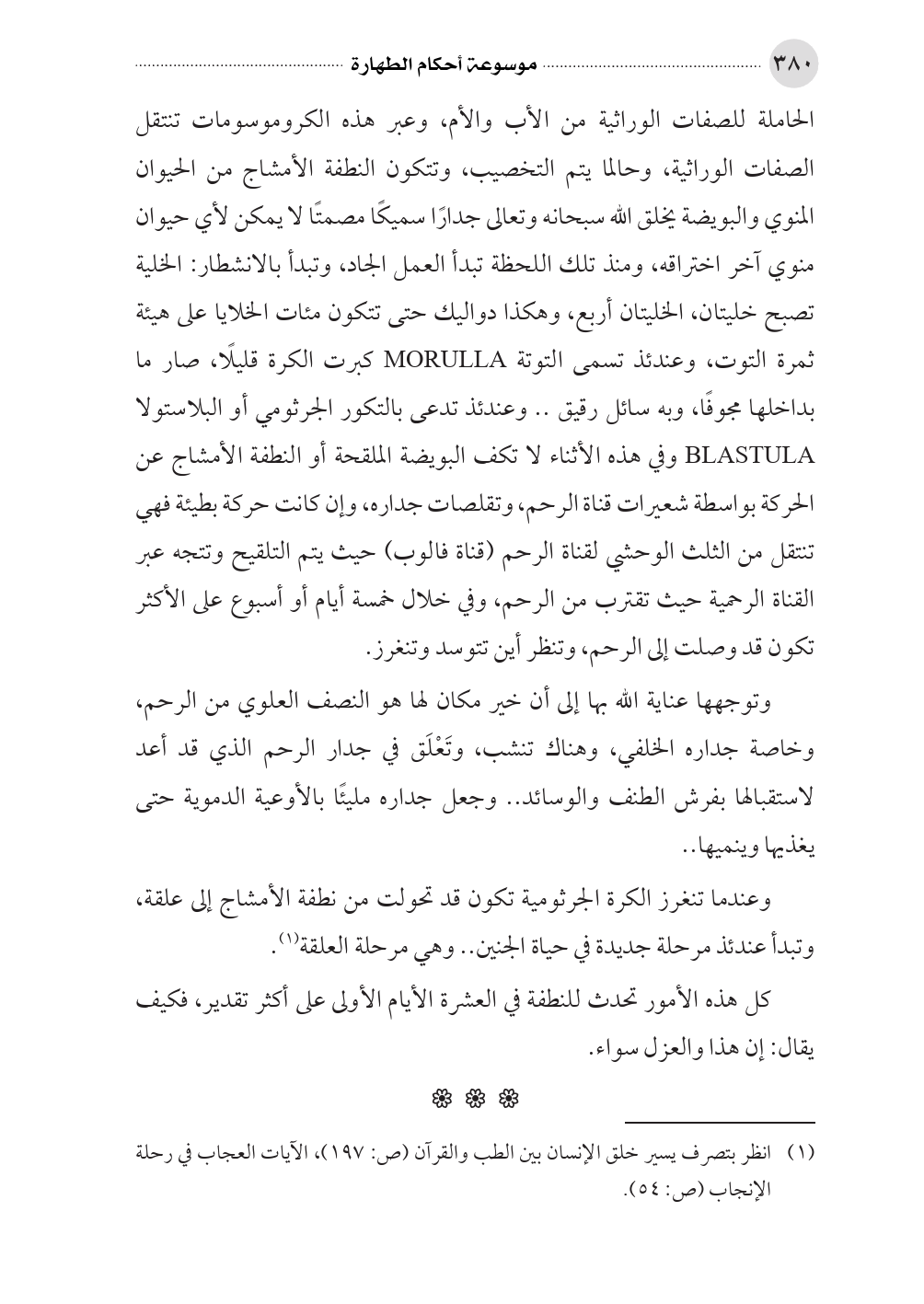 الحاملة للصفات الوراثية من الأب والأم، وعبر هذه الكروموسومات تنتقل الصفات الوراثية، وحالما يتم التخصيب، وتتكون النطفة الأمشاج من الحيوان المنوي والبويضة يخلق الله سبحانه وتعالى جدارًا سميكًا مصمتًا لا يمكن لأي حيوان منوي آخر اختراقه، ومنذ تلك اللحظة تبدأ العمل الجاد، وتبدأ بالانشطار: الخلية تصبح خليتان، الخليتان أربع، وهكذا دواليك حتى تتكون مئات الخلايا على هيئة ثمرة التوت، وعندئذ تسمى التوتة MORULLA كبرت الكرة قليلًا، صار ما بداخلها مجوفًا، وبه سائل رقيق .. وعندئذ تدعى بالتكور الجرثومي أو البلاستولا BLASTULA وفي هذه الأثناء لا تكف البويضة الملقحة أو النطفة الأمشاج عن الحركة بواسطة شعيرات قناة الرحم، وتقلصات جداره، وإن كانت حركة بطيئة فهي تنتقل من الثلث الوحشي لقناة الرحم (قناة فالوب) حيث يتم التلقيح وتتجه عبر القناة الرحمية حيث تقترب من الرحم، وفي خلال خمسة أيام أو أسبوع على الأكثر تكون قد وصلت إلى الرحم، وتنظر أين تتوسد وتنغرز.