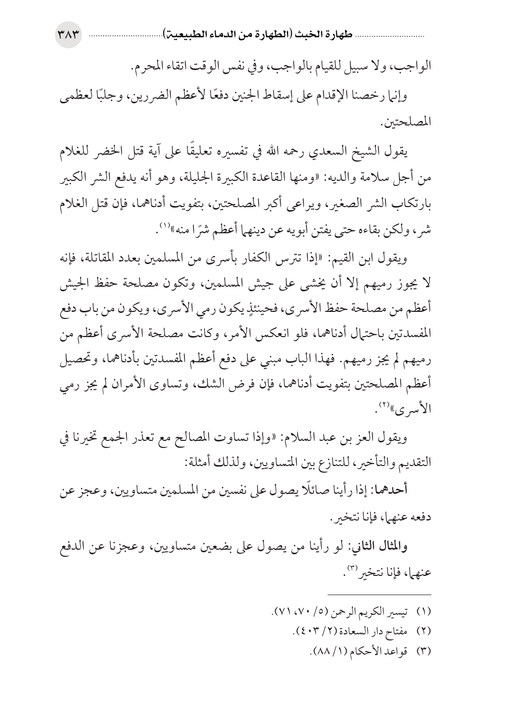 ويقول ابن القيم: «إذا تترس الكفار بأسرى من المسلمين بعدد المقاتلة، فإنه لا يجوز رميهم إلا أن يخشى على جيش المسلمين، وتكون مصلحة حفظ الجيش أعظم من مصلحة حفظ الأسرى، فحينئذٍ يكون رمي الأسرى، ويكون من باب دفع المفسدتين باحتمال أدناهما، فلو انعكس الأمر، وكانت مصلحة الأسرى أعظم من رميهم لم يجز رميهم. فهذا الباب مبني على دفع أعظم المفسدتين بأدناهما، وتحصيل أعظم المصلحتين بتفويت أدناهما، فإن فرض الشك، وتساوى الأمران لم يجز رمي الأسرى» (¬٢).