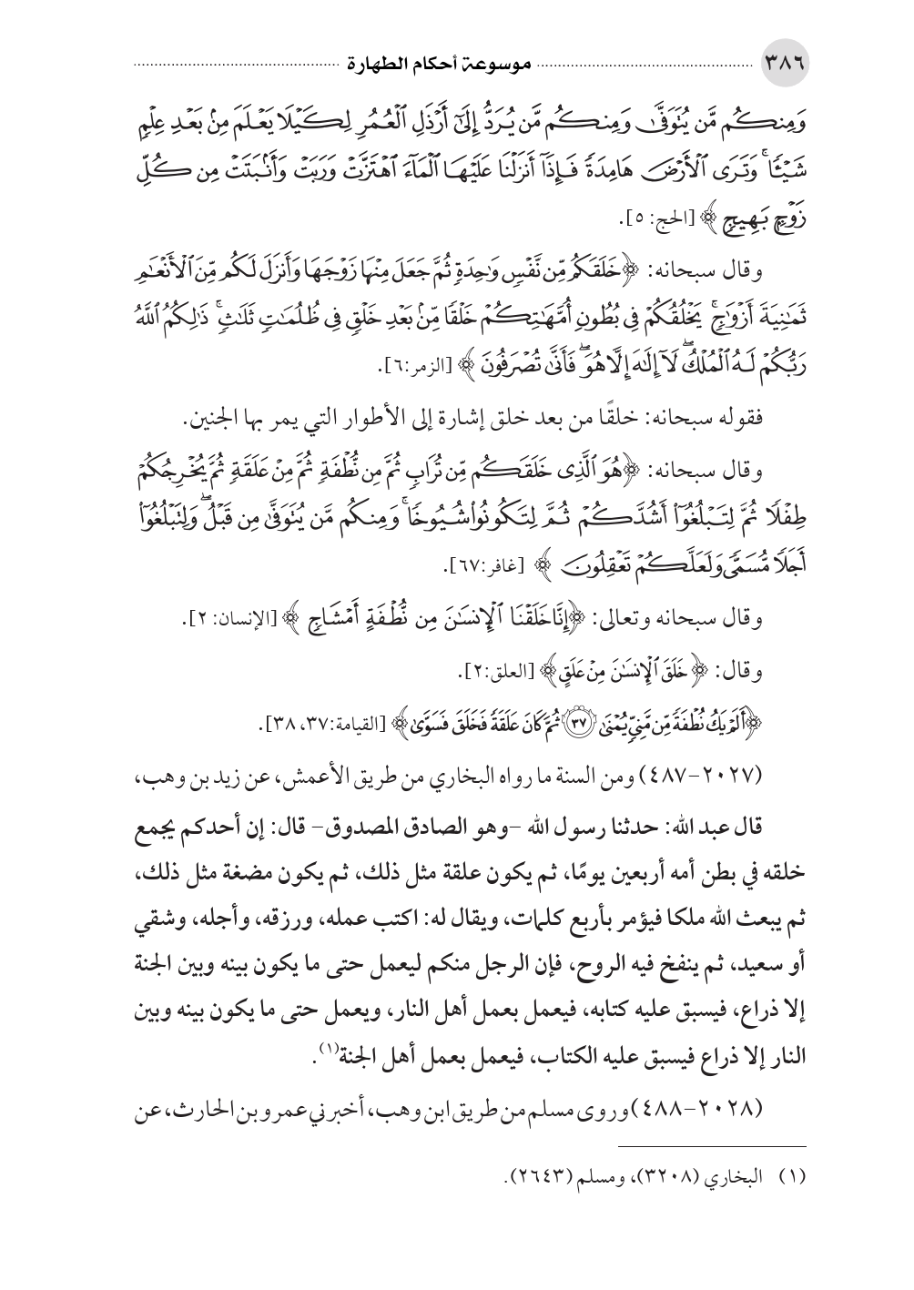 وقال سبحانه: (هُوَ الَّذِي خَلَقَكُم مِّن تُرَابٍ ثُمَّ مِن نُّطْفَةٍ ثُمَّ مِنْ عَلَقَةٍ ثُمَّ يُخْرِجُكُمْ طِفْلاً ثُمَّ لِتَبْلُغُوا أَشُدَّكُمْ ثُمَّ لِتَكُونُوا شُيُوخاً وَمِنكُم مَّن يُتَوَفَّى مِن قَبْلُ وَلِتَبْلُغُوا أَجَلاً مُّسَمًّى وَلَعَلَّكُمْ تَعْقِلُونَ) [غافر: ٦٧].
