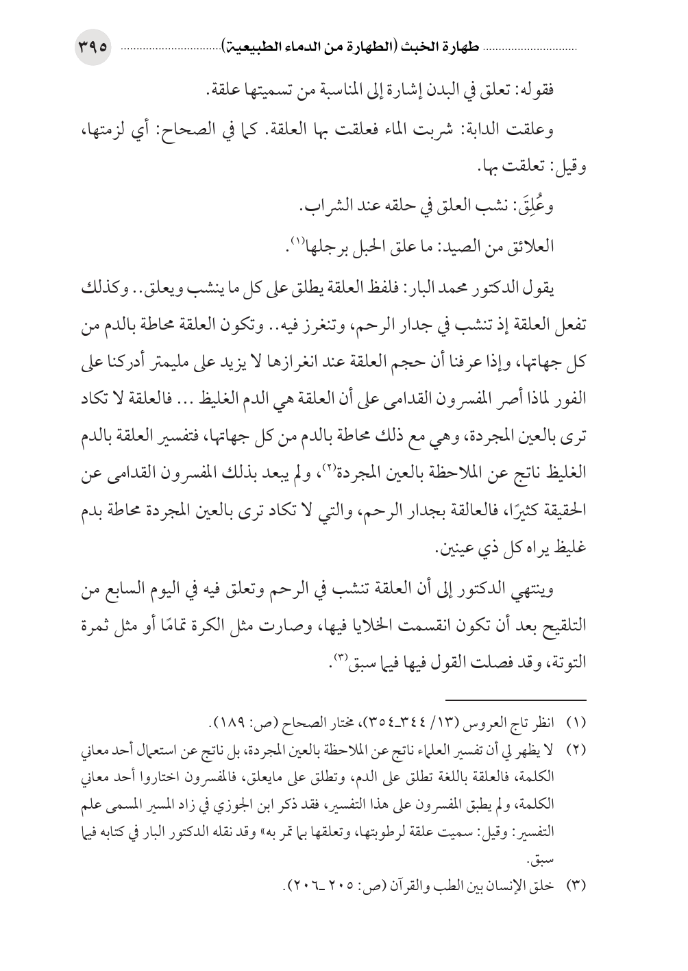 (¬٢) لا يظهر لي أن تفسير العلماء ناتج عن الملاحظة بالعين المجردة، بل ناتج عن استعمال أحد معاني الكلمة، فالعلقة باللغة تطلق على الدم، وتطلق على مايعلق، فالمفسرون اختاروا أحد معاني الكلمة، ولم يطبق المفسرون على هذا التفسير، فقد ذكر ابن الجوزي في زاد المسير المسمى علم التفسير: وقيل: سميت علقة لرطوبتها، وتعلقها بما تمر به» وقد نقله الدكتور البار في كتابه فيما سبق.