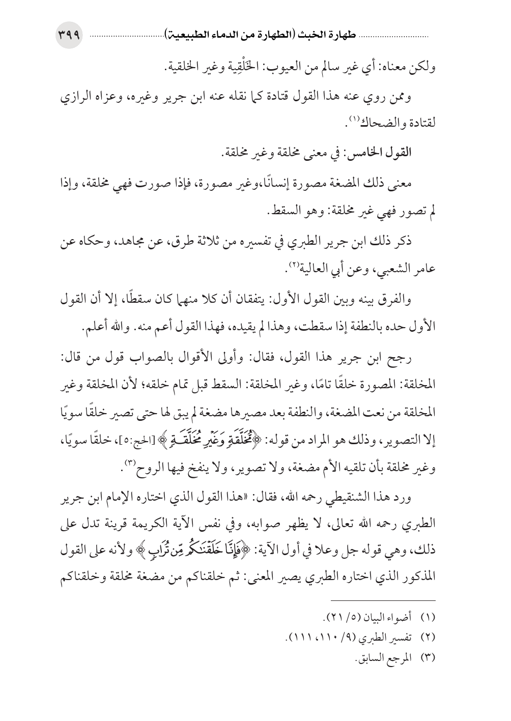رجح ابن جرير هذا القول، فقال: وأولى الأقوال بالصواب قول من قال: المخلقة: المصورة خلقًا تامًا، وغير المخلقة: السقط قبل تمام خلقه؛ لأن المخلقة وغير المخلقة من نعت المضغة، والنطفة بعد مصيرها مضغة لم يبق لها حتى تصير خلقًا سويًا إلا التصوير، وذلك هو المراد من قوله: (مُّخَلَّقَةٍ وَغَيْرِ مُخَلَّقَةٍ) [الحج: ٥]، خلقًا سويًا، وغير مخلقة بأن تلقيه الأم مضغة، ولا تصوير، ولا ينفخ فيها الروح (¬٣).