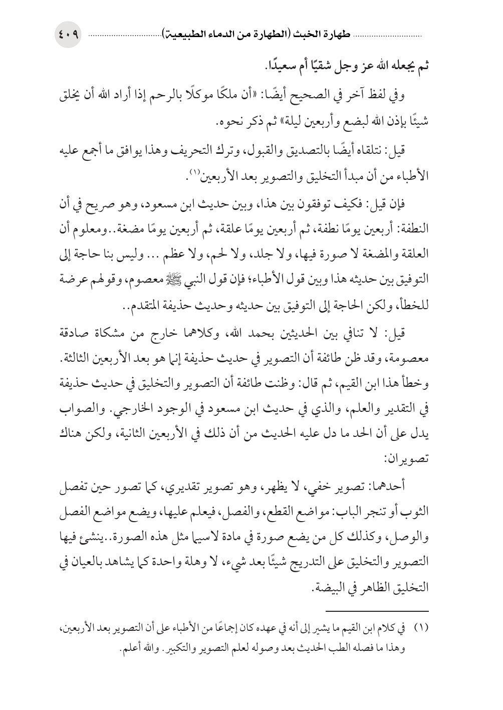 فإن قيل: فكيف توفقون بين هذا، وبين حديث ابن مسعود، وهو صريح في أن النطفة: أربعين يومًا نطفة، ثم أربعين يومًا علقة، ثم أربعين يومًا مضغة .. ومعلوم أن العلقة والمضغة لا صورة فيها، ولا جلد، ولا لحم، ولا عظم ... وليس بنا حاجة إلى التوفيق بين حديثه هذا وبين قول الأطباء؛ فإن قول النبي صلى الله عليه وسلم معصوم، وقولهم عرضة للخطأ، ولكن الحاجة إلى التوفيق بين حديثه وحديث حذيفة المتقدم ..
