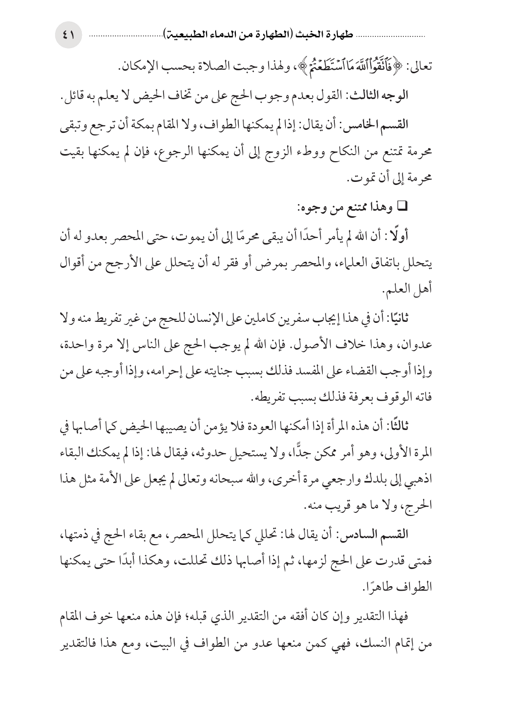 ثالثًا: أن هذه المرأة إذا أمكنها العودة فلا يؤمن أن يصيبها الحيض كما أصابها في المرة الأولى، وهو أمر ممكن جدًّا، ولا يستحيل حدوثه، فيقال لها: إذا لم يمكنك البقاء اذهبي إلى بلدك وارجعي مرة أخرى، والله سبحانه وتعالى لم يجعل على الأمة مثل هذا الحرج، ولا ما هو قريب منه.