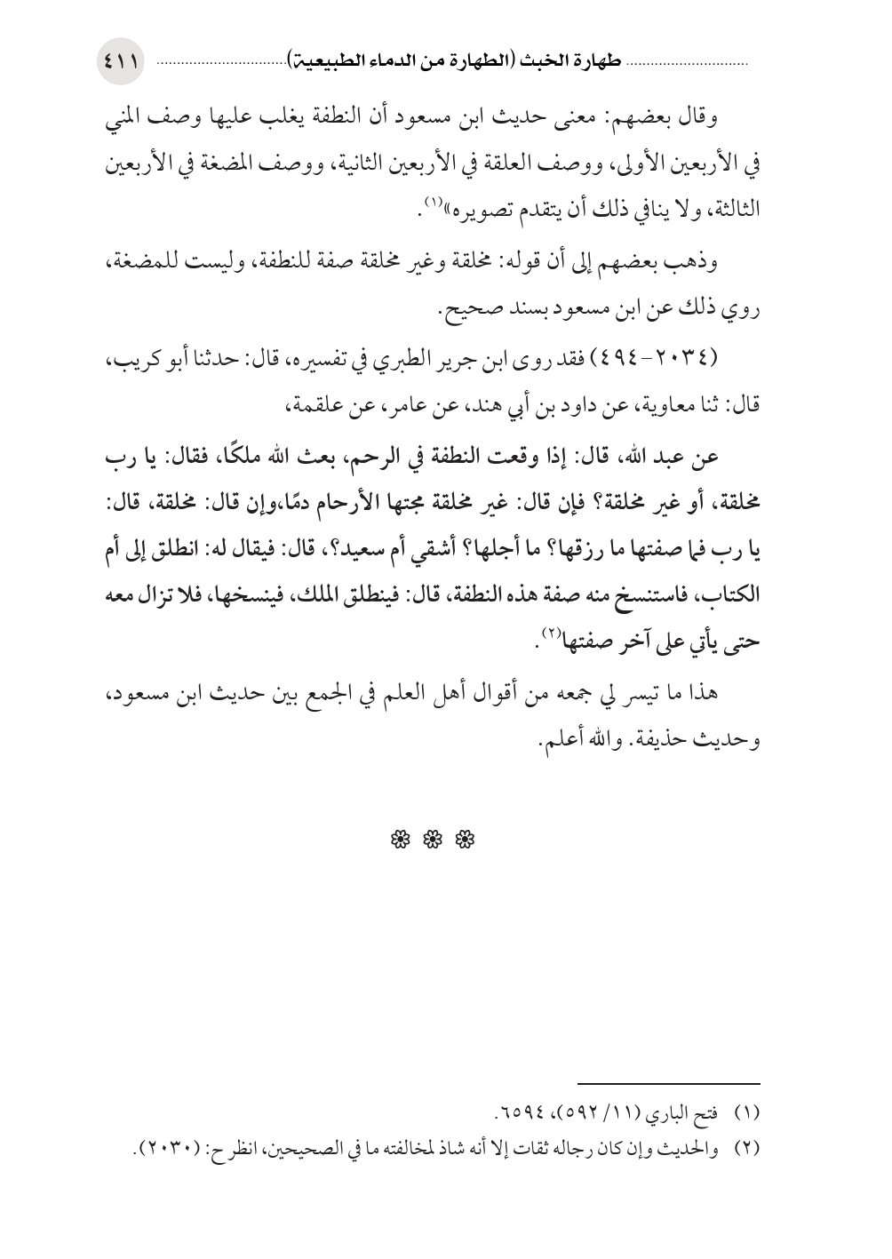 وقال بعضهم: معنى حديث ابن مسعود أن النطفة يغلب عليها وصف المني في الأربعين الأولى، ووصف العلقة في الأربعين الثانية، ووصف المضغة في الأربعين الثالثة، ولا ينافي ذلك أن يتقدم تصويره» (¬١).