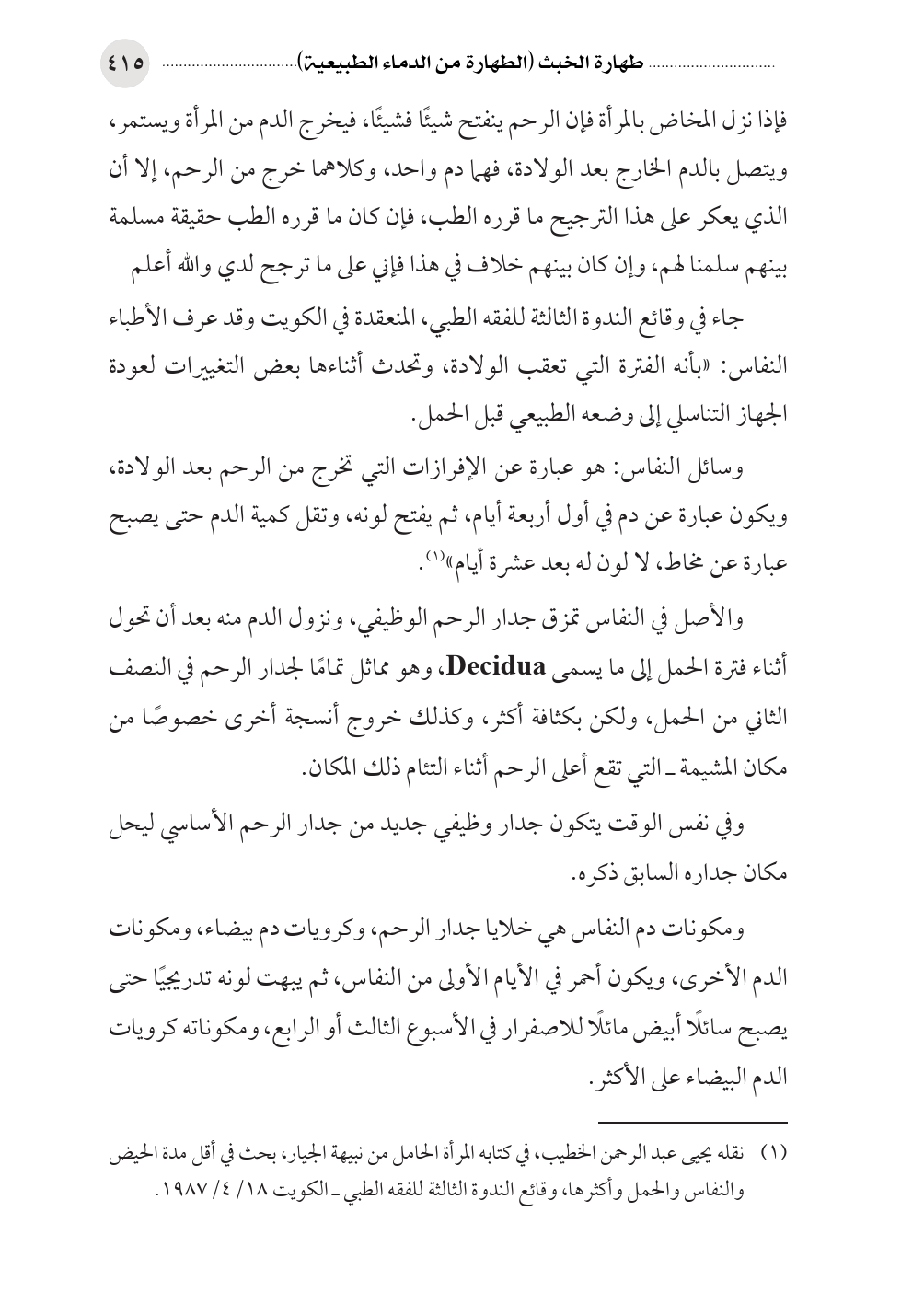 (¬١) نقله يحيى عبد الرحمن الخطيب، في كتابه المرأة الحامل من نبيهة الجيار، بحث في أقل مدة الحيض والنفاس والحمل وأكثرها، وقائع الندوة الثالثة للفقه الطبي ـ الكويت ١٨/ ٤/١٩٨٧.