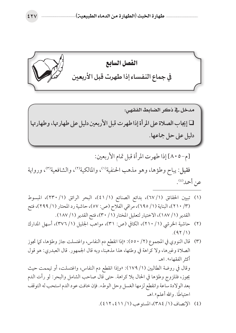 (¬٣) قال النووي في المجموع (٢/ ٥٥٠): «إذا انقطع دم النفاس، واغتسلت جاز وطؤها، كما تجوز الصلاة وغيرها، ولا كراهة في وطئها، هذا مذهبنا، وبه قال الجمهور. قال العبدري: هو قول أكثر الفقهاء». اهـ