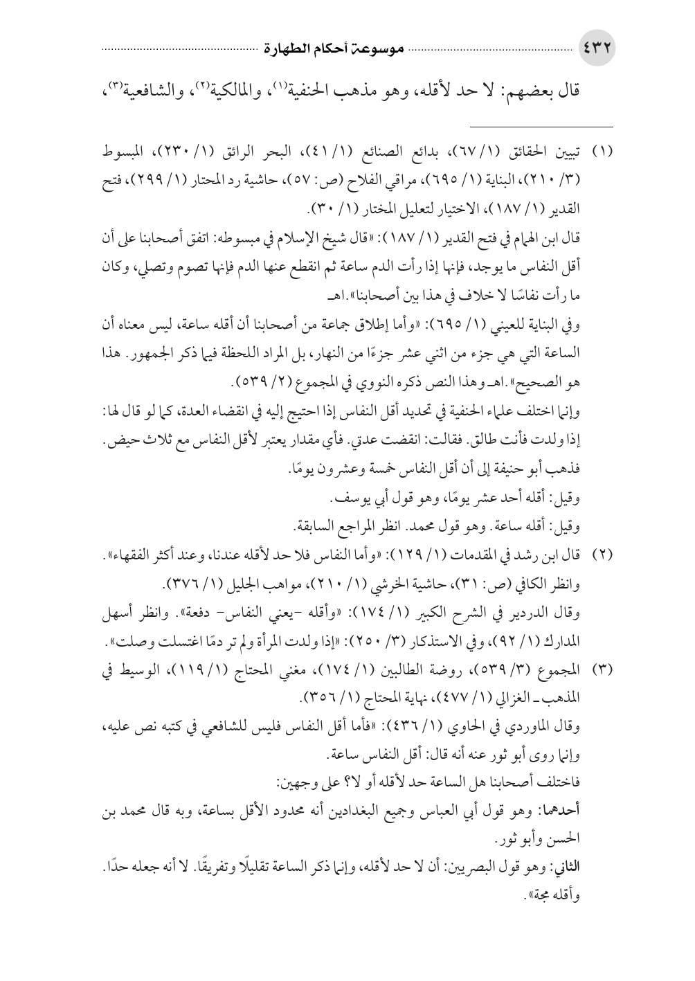 (¬٢) قال ابن رشد في المقدمات (١/ ١٢٩): «وأما النفاس فلا حد لأقله عندنا، وعند أكثر الفقهاء».