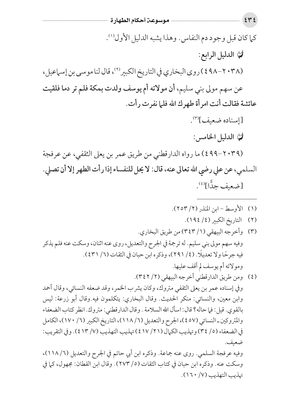 (٢٠٣٩ - ٤٩٩) ما رواه الدارقطني من طريق عمر بن يعلى الثقفي، عن عرفجة السلمي، عن علي رضي الله تعالى عنه، قال: لا يحل للنفساء إذا رأت الطهر إلا أن تصلي.