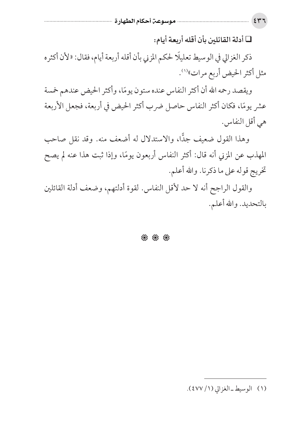 ذكر الغزالي في الوسيط تعليلًا لحكم المزني بأن أقله أربعة أيام، فقال: «لأن أكثره مثل أكثر الحيض أربع مرات» (¬١).