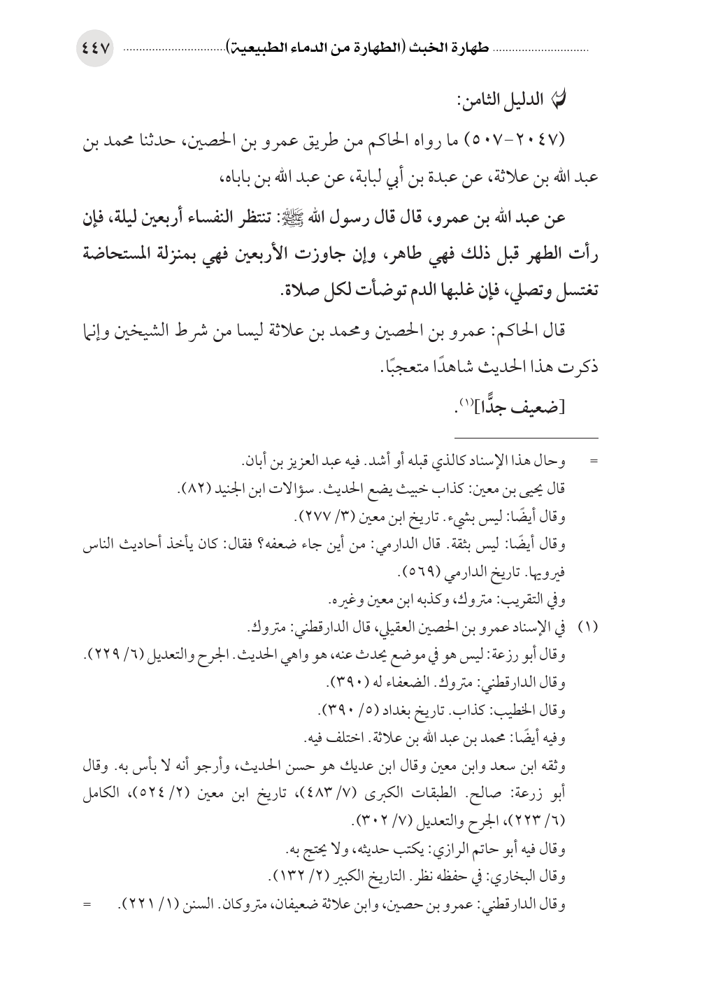 (٢٠٤٧ - ٥٠٧) ما رواه الحاكم من طريق عمرو بن الحصين، حدثنا محمد بن عبد الله بن علاثة، عن عبدة بن أبي لبابة، عن عبد الله بن باباه،