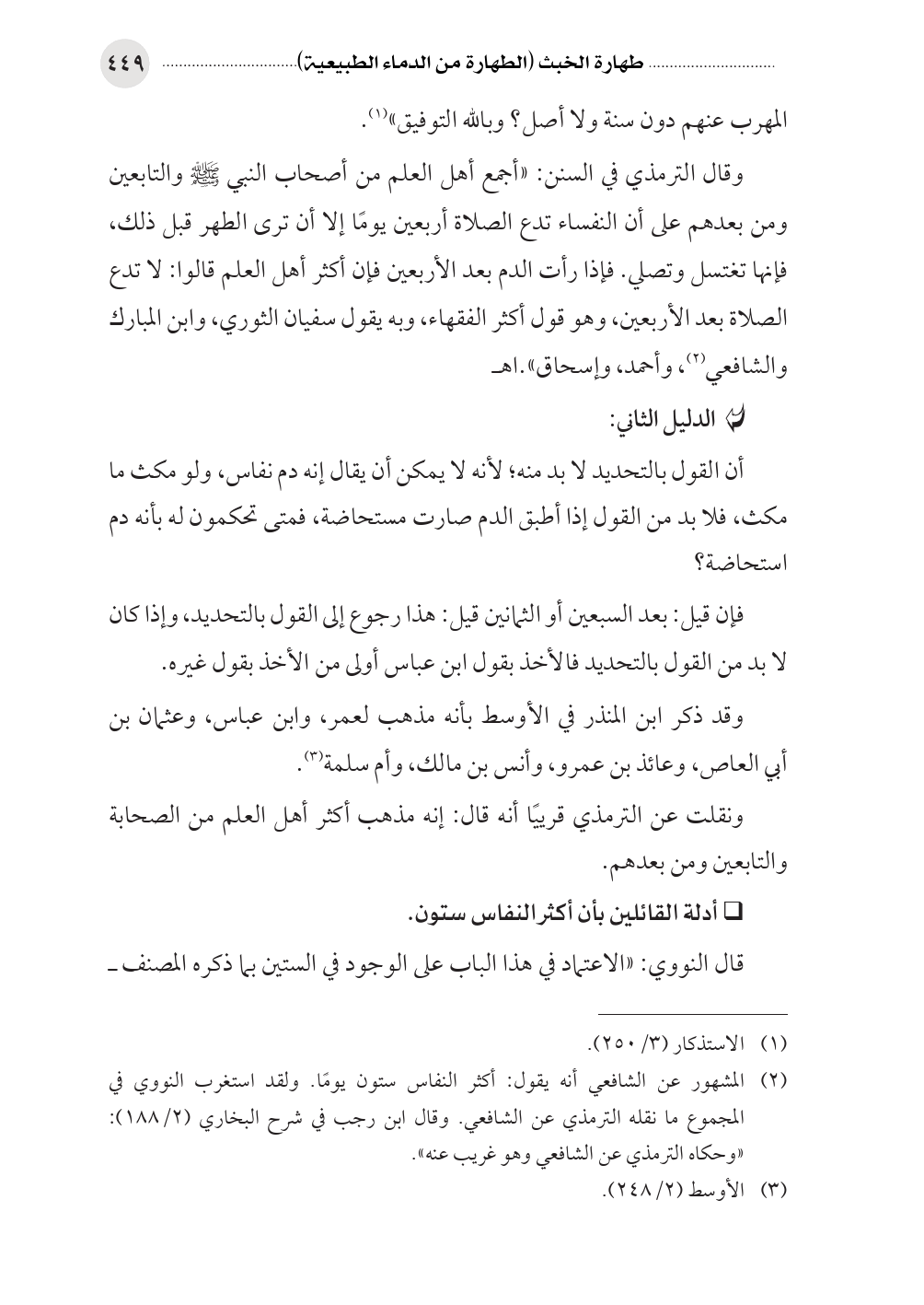 (¬٢) المشهور عن الشافعي أنه يقول: أكثر النفاس ستون يومًا. ولقد استغرب النووي في المجموع ما نقله الترمذي عن الشافعي. وقال ابن رجب في شرح البخاري (٢/ ١٨٨):