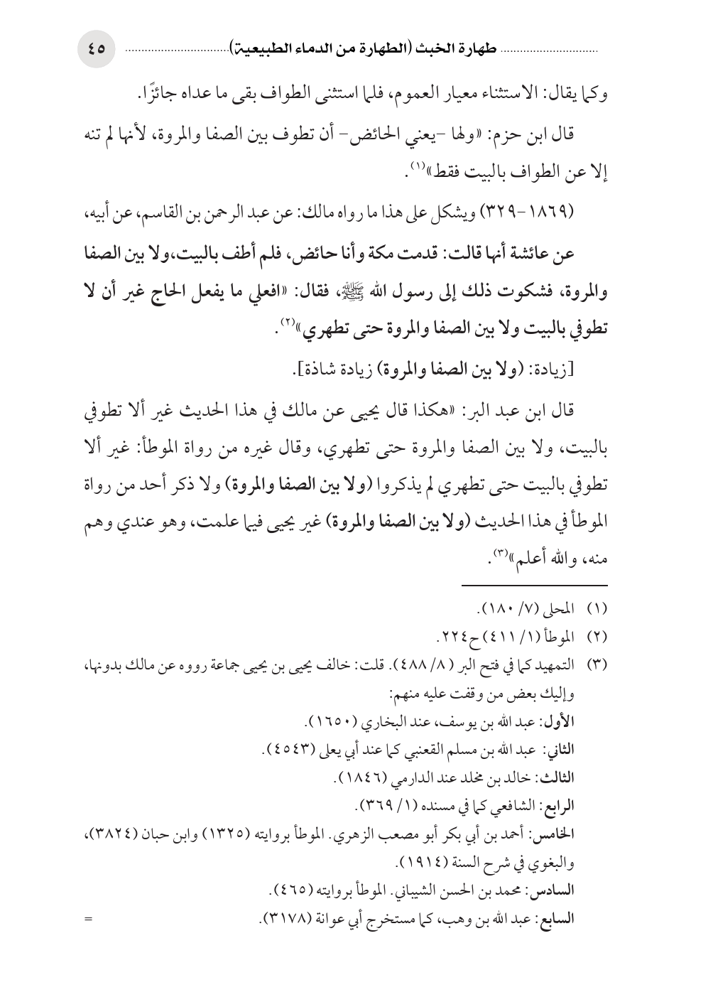 قال ابن عبد البر: «هكذا قال يحيى عن مالك في هذا الحديث غير ألا تطوفي بالبيت، ولا بين الصفا والمروة حتى تطهري، وقال غيره من رواة الموطأ: غير ألا تطوفي بالبيت حتى تطهري لم يذكروا (ولا بين الصفا والمروة) ولا ذكر أحد من رواة الموطأ في هذا الحديث (ولا بين الصفا والمروة) غير يحيى فيما علمت، وهو عندي وهم منه، والله أعلم «(¬٣).