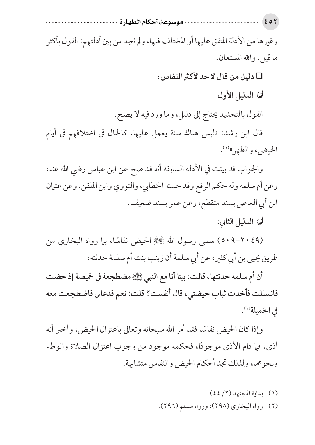 (٢٠٤٩ - ٥٠٩) سمى رسول الله صلى الله عليه وسلم الحيض نفاسًا، بما رواه البخاري من طريق يحيى بن أبي كثير، عن أبي سلمة أن زينب بنت أم سلمة حدثته،