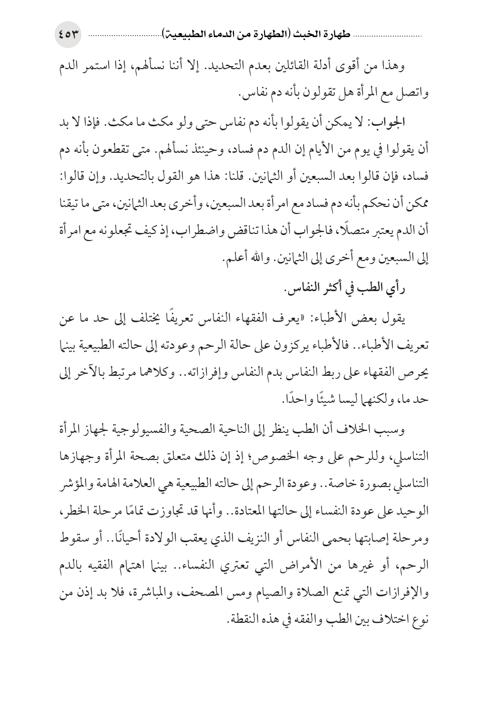 الجواب: لا يمكن أن يقولوا بأنه دم نفاس حتى ولو مكث ما مكث. فإذا لا بد أن يقولوا في يوم من الأيام إن الدم دم فساد، وحينئذ نسألهم. متى تقطعون بأنه دم فساد، فإن قالوا بعد السبعين أو الثمانين. قلنا: هذا هو القول بالتحديد. وإن قالوا: ممكن أن نحكم بأنه دم فساد مع امرأة بعد السبعين، وأخرى بعد الثمانين، متى ما تيقنا أن الدم يعتبر متصلًا، فالجواب أن هذا تناقض واضطراب، إذ كيف تجعلونه مع امرأة إلى السبعين ومع أخرى إلى الثمانين. والله أعلم.