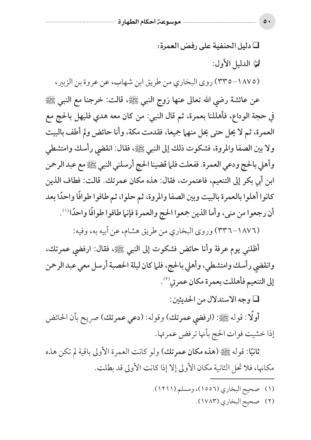 عن عائشة رضي الله تعالى عنها زوج النبي صلى الله عليه وسلم، قالت: خرجنا مع النبي صلى الله عليه وسلم في حجة الوداع، فأهللنا بعمرة، ثم قال النبي: من كان معه هدي فليهل بالحج مع العمرة، ثم لا يحل حتى يحل منهما جميعا، فقدمت مكة، وأنا حائض ولم أطف بالبيت ولا بين الصفا والمروة، فشكوت ذلك إلى النبي صلى الله عليه وسلم، فقال: انقضي رأسك وامتشطي وأهلي بالحج ودعي العمرة. ففعلت فلما قضينا الحج أرسلني النبي صلى الله عليه وسلم مع عبد الرحمن ابن أبي بكر إلى التنعيم، فاعتمرت، فقال: هذه مكان عمرتك. قالت: فطاف الذين كانوا أهلوا بالعمرة بالبيت وبين الصفا والمروة، ثم حلوا، ثم طافوا طوافًا واحدًا بعد أن رجعوا من منى، وأما الذين جمعوا الحج والعمرة فإنما طافوا طوافًا واحدًا (¬١).
