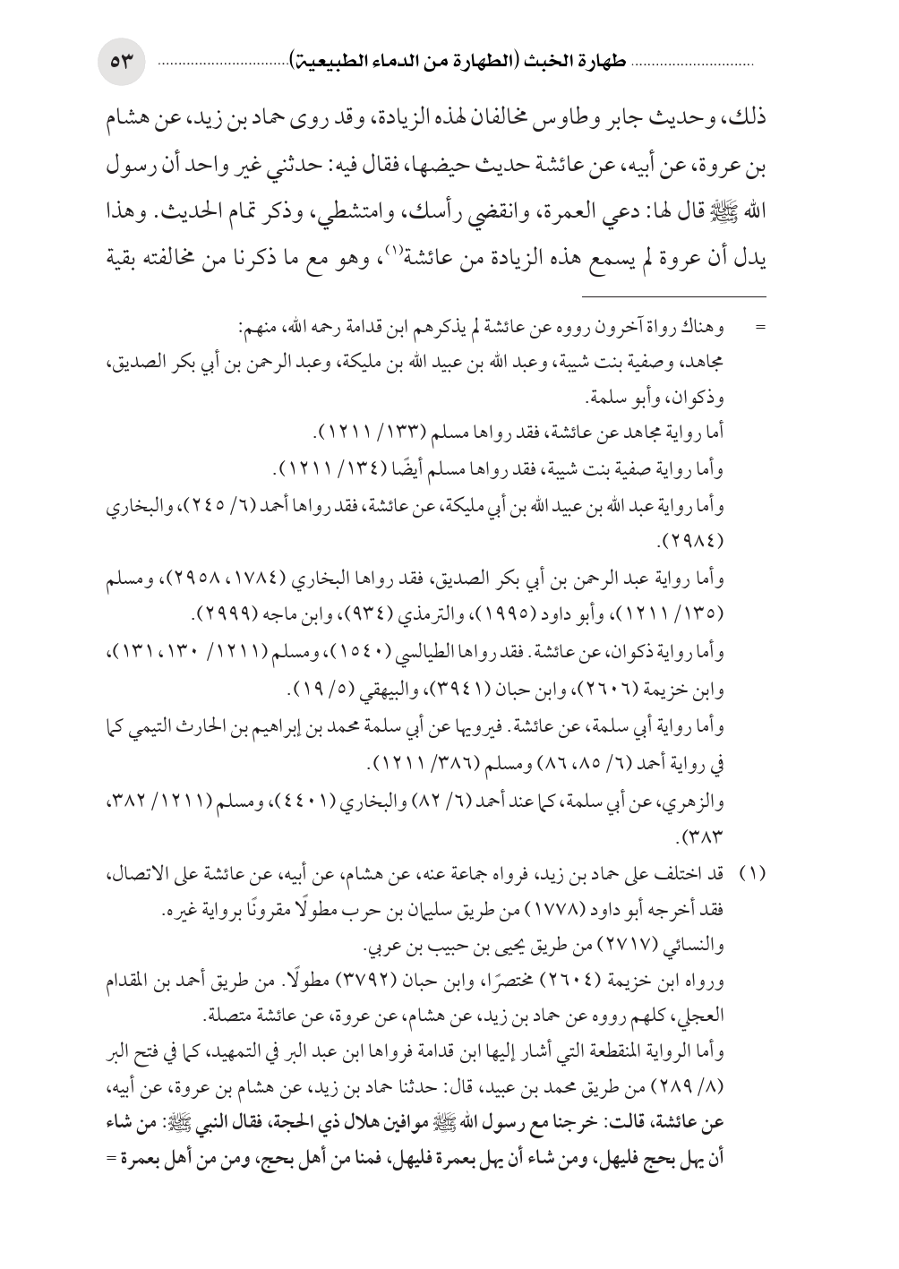 ذلك، وحديث جابر وطاوس مخالفان لهذه الزيادة، وقد روى حماد بن زيد، عن هشام بن عروة، عن أبيه، عن عائشة حديث حيضها، فقال فيه: حدثني غير واحد أن رسول الله صلى الله عليه وسلم قال لها: دعي العمرة، وانقضي رأسك، وامتشطي، وذكر تمام الحديث. وهذا يدل أن عروة لم يسمع هذه الزيادة من عائشة (¬١)،