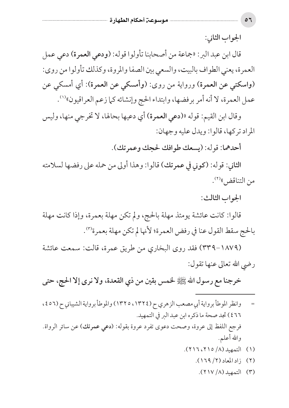 قال ابن عبد البر: «جماعة من أصحابنا تأولوا قوله: (ودعي العمرة) دعي عمل العمرة، يعني الطواف بالبيت، والسعي بين الصفا والمروة، وكذلك تأولوا من روى: (واسكتي عن العمرة) ورواية من روى: (وأمسكي عن العمرة): أي أمسكي عن عمل العمرة، لا أنه أمر برفضها، وابتداء الحج وإنشائه كما زعم العراقيون» (¬١).