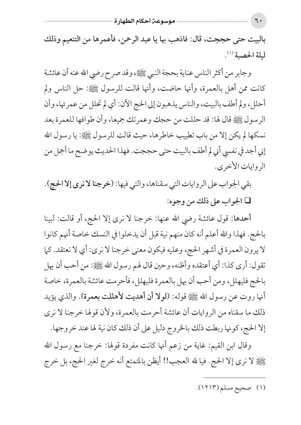 وجابر من أكثر الناس عناية بحجة النبي صلى الله عليه وسلم، وقد صرح رضي الله عنه أن عائشة كانت ممن أهل بالعمرة، وأنها حاضت، وأنها قالت للرسول صلى الله عليه وسلم: حل الناس ولم أحلل، ولم أطف بالبيت، والناس يذهبون إلى الحج الآن: أي لم تحلل من عمرتها، وأن الرسول صلى الله عليه وسلم قال لها: قد حللت من حجك وعمرتك جميعا، وأن طوافها للعمرة بعد نسكها لم يكن إلا من باب تطييب خاطرها، حيث قالت للرسول صلى الله عليه وسلم: يا رسول الله إني أجد في نفسي أني لم أطف بالبيت حتى حججت. فهذا الحديث يوضح ما أجمل من الروايات الأخرى.