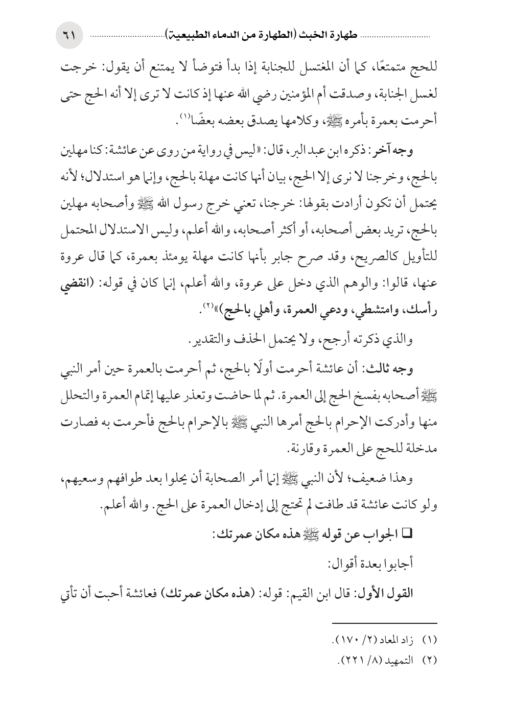 وجه آخر: ذكره ابن عبد البر، قال: «ليس في رواية من روى عن عائشة: كنا مهلين بالحج، وخرجنا لا نرى إلا الحج، بيان أنها كانت مهلة بالحج، وإنما هو استدلال؛ لأنه يحتمل أن تكون أرادت بقولها: خرجنا، تعني خرج رسول الله صلى الله عليه وسلم وأصحابه مهلين بالحج، تريد بعض أصحابه، أو أكثر أصحابه، والله أعلم، وليس الاستدلال المحتمل للتأويل كالصريح، وقد صرح جابر بأنها كانت مهلة يومئذ بعمرة، كما قال عروة عنها، قالوا: والوهم الذي دخل على عروة، والله أعلم، إنما كان في قوله: (انقضي رأسك، وامتشطي، ودعي العمرة، وأهلي بالحج)» (¬٢).