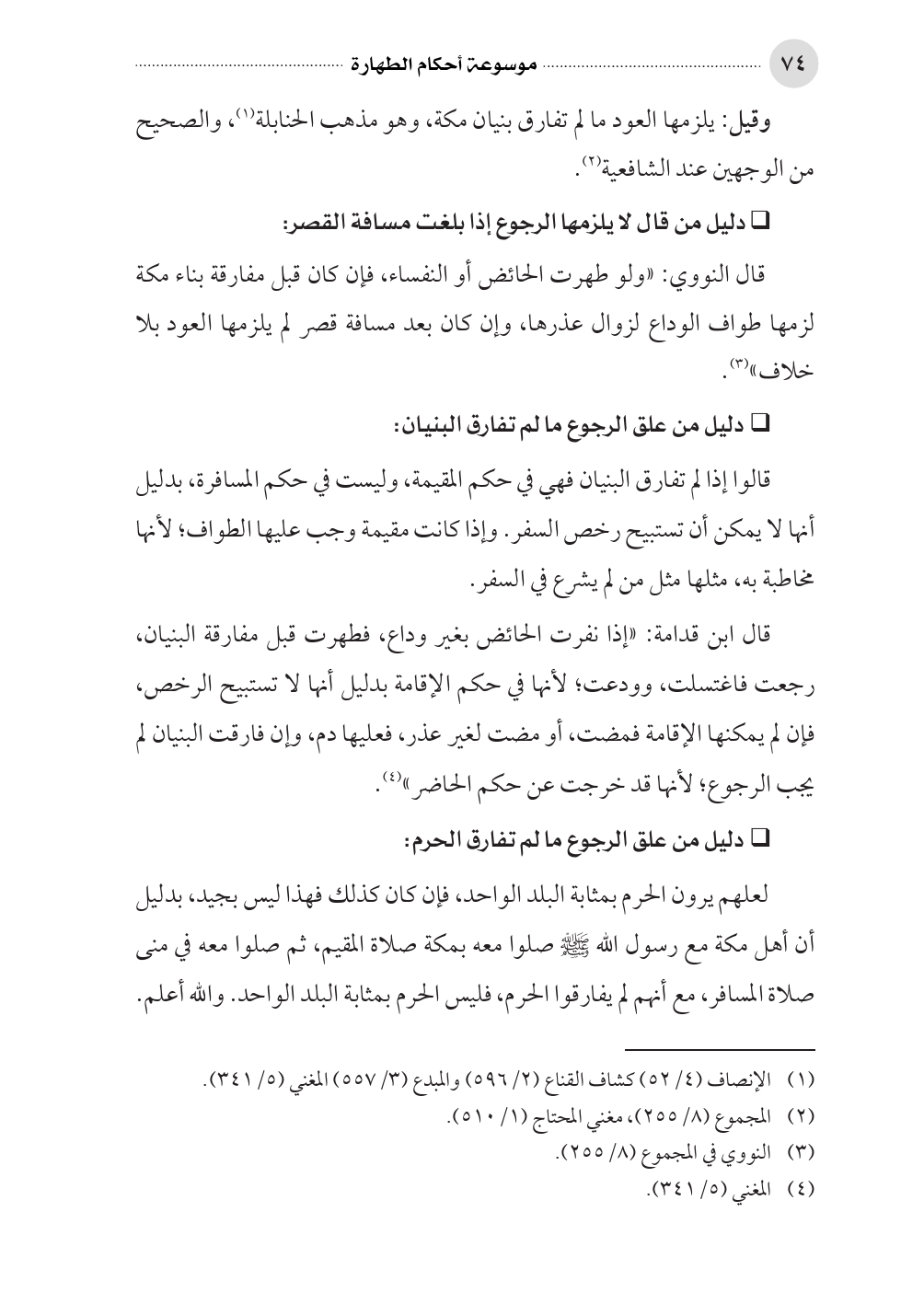 قال النووي: «ولو طهرت الحائض أو النفساء، فإن كان قبل مفارقة بناء مكة لزمها طواف الوداع لزوال عذرها، وإن كان بعد مسافة قصر لم يلزمها العود بلا خلاف» (¬٣).