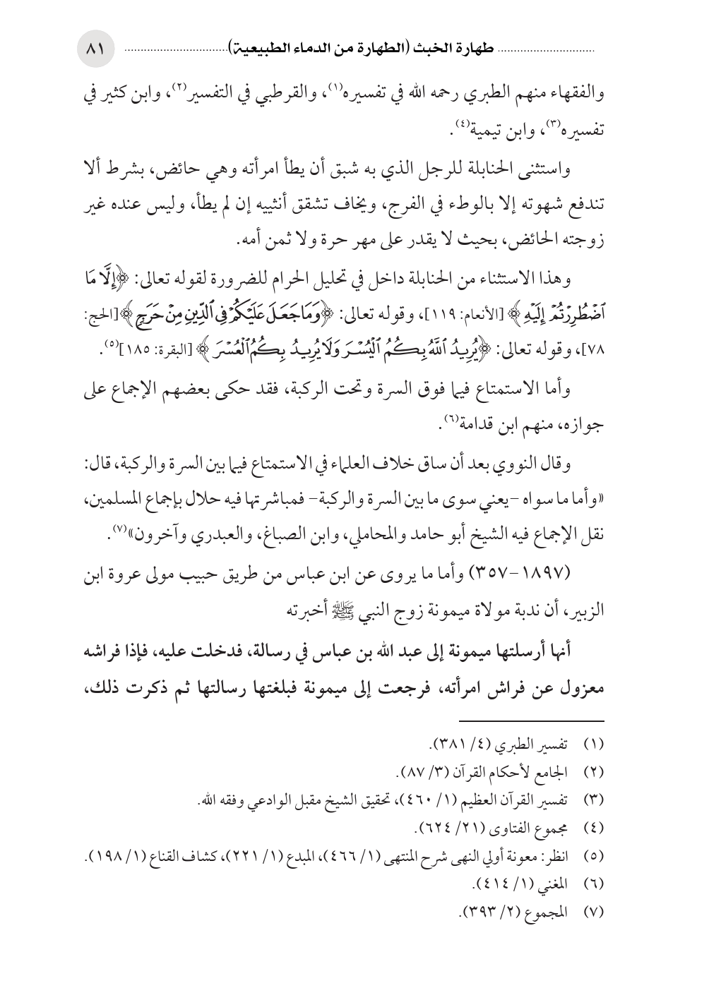 وقال النووي بعد أن ساق خلاف العلماء في الاستمتاع فيما بين السرة والركبة، قال: «وأما ما سواه -يعني سوى ما بين السرة والركبة- فمباشرتها فيه حلال بإجماع المسلمين، نقل الإجماع فيه الشيخ أبو حامد والمحاملي، وابن الصباغ، والعبدري وآخرون» (¬٧).