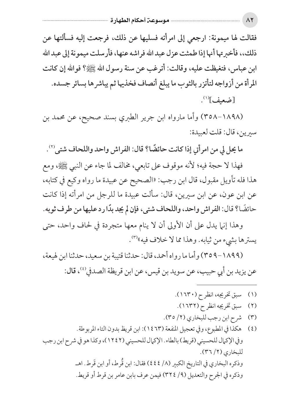 فقالت لها ميمونة: ارجعي إلى امرأته فسليها عن ذلك، فرجعت إليه فسألتها عن ذلك، ، فأخبرتها أنها إذا طمثت عزل عبد الله فراشه عنها، فأرسلت ميمونة إلى عبد الله ابن عباس، فتغيظت عليه، وقالت: أترغب عن سنة رسول الله صلى الله عليه وسلم؟ فوالله إن كانت المرأة من أزواجه لتأتزر بالثوب ما يبلغ أنصاف فخذيها ثم يباشرها بسائر جسده.