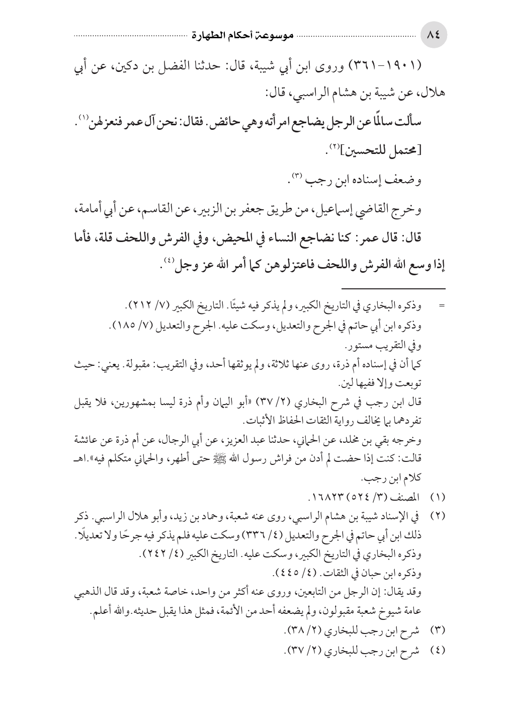 (١٩٠١ - ٣٦١) وروى ابن أبي شيبة، قال: حدثنا الفضل بن دكين، عن أبي هلال، عن شيبة بن هشام الراسبي، قال: