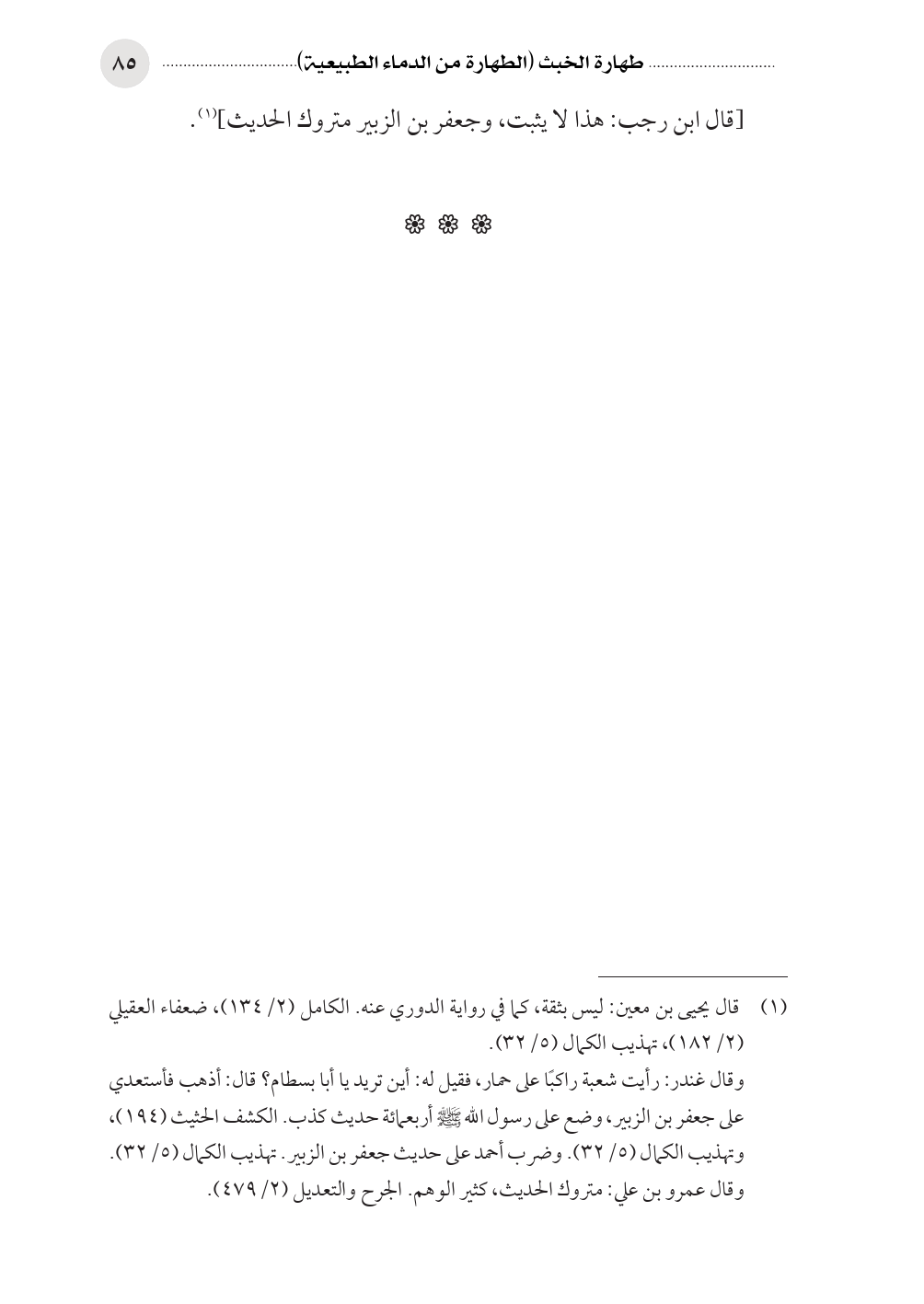 وقال غندر: رأيت شعبة راكبًا على حمار، فقيل له: أين تريد يا أبا بسطام؟ قال: أذهب فأستعدي على جعفر بن الزبير، وضع على رسول الله صلى الله عليه وسلم أربعمائة حديث كذب. الكشف الحثيث (١٩٤)، وتهذيب الكمال (٥/ ٣٢). وضرب أحمد على حديث جعفر بن الزبير. تهذيب الكمال (٥/ ٣٢). وقال عمرو بن علي: متروك الحديث، كثير الوهم. الجرح والتعديل (٢/ ٤٧٩).