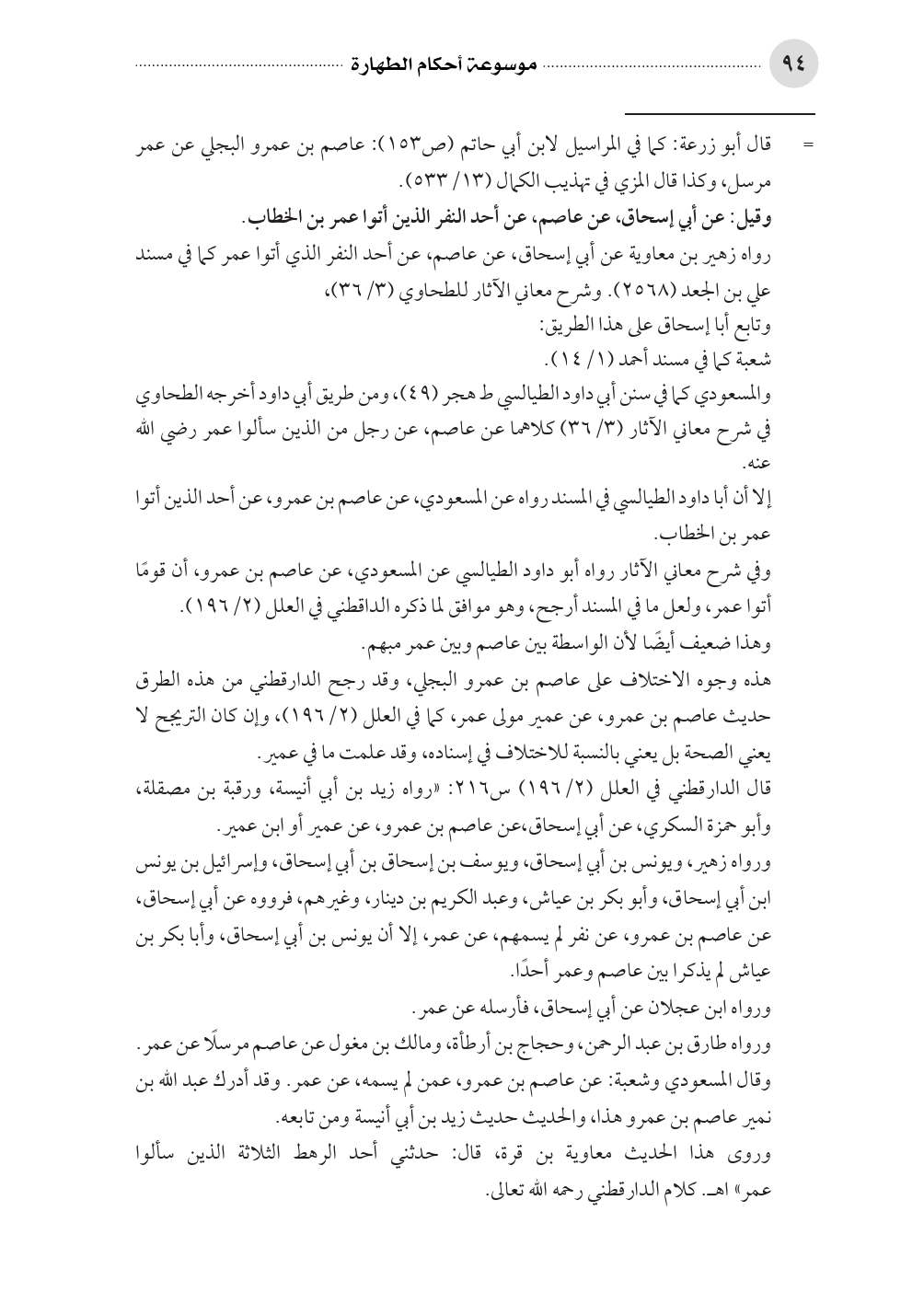 رواه زهير بن معاوية عن أبي إسحاق، عن عاصم، عن أحد النفر الذي أتوا عمر كما في مسند علي بن الجعد (٢٥٦٨). وشرح معاني الآثار للطحاوي (٣/ ٣٦)، وتابع أبا إسحاق على هذا الطريق:
