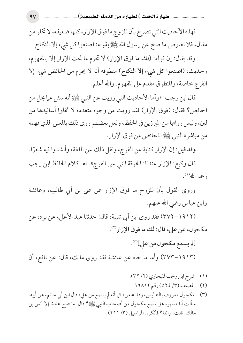 قال ابن رجب: «وأما الأحاديث التي رويت عن النبي صلى الله عليه وسلم أنه سئل عما يحل من الحائض؟ فقال: (فوق الإزار) فقد رويت من وجوه متعددة لا تخلوا أسانيدها من لين، وليس رواتها من المبرزين في الحفظ، ولعل بعضهم روى ذلك بالمعنى الذي فهمه من مباشرة النبي صلى الله عليه وسلم للحائض من فوق الإزار.