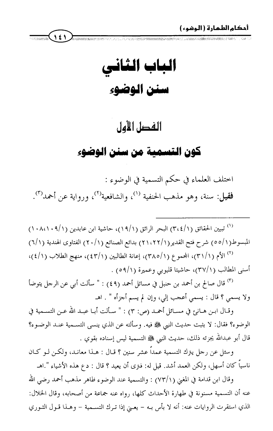 (¬٣) قال صالح بن أحمد بن حنبل في مسائل أحمد (٤٩): " سألت أبي عن الرجل يتوضأ ولا يسمي؟ قال: يسمي أعجب إلي، وإن لم يسم أجزأه ". اهـ