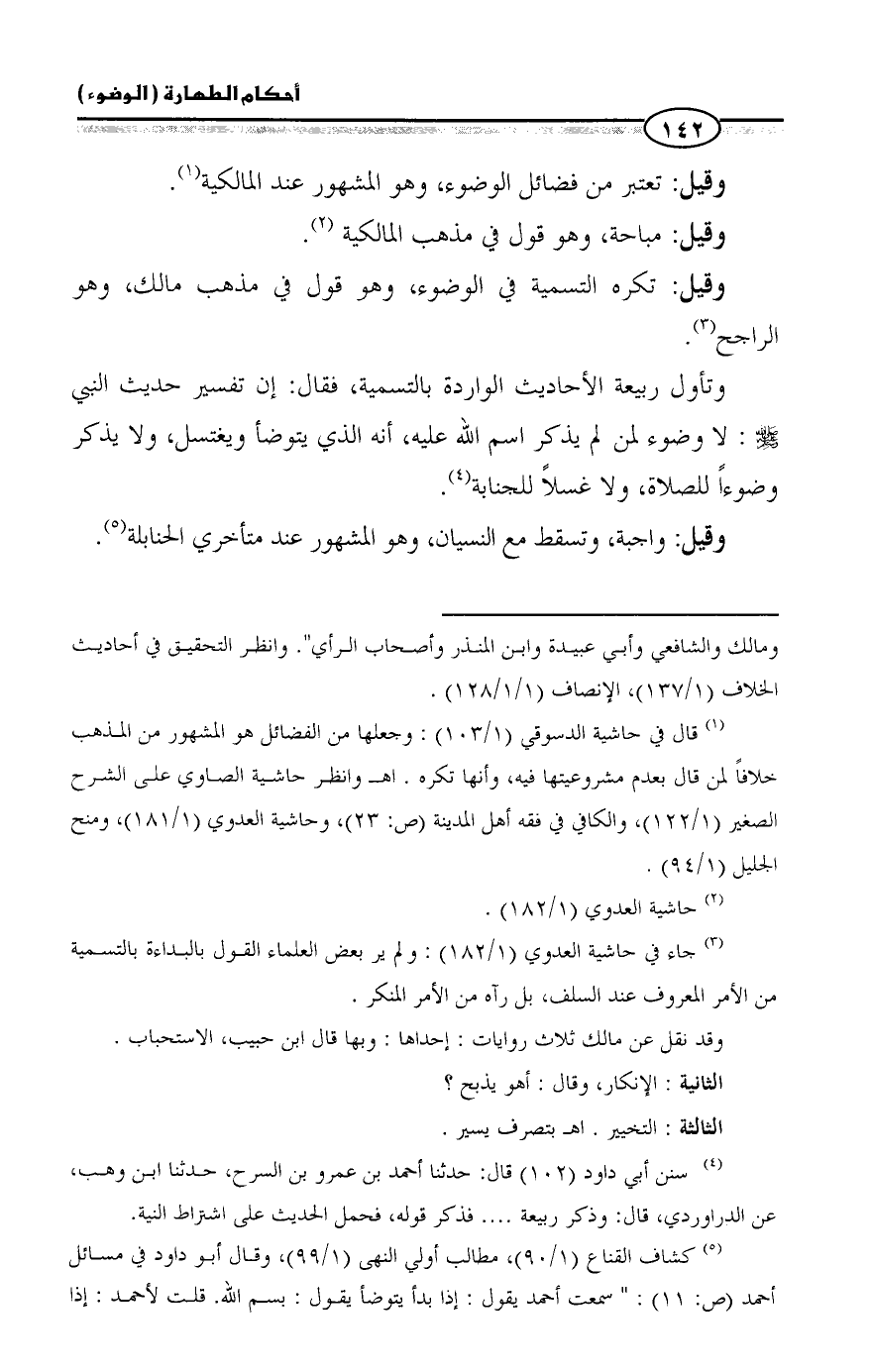 (¬٥) كشاف القناع (١/ ٩٠)، مطالب أولي النهى (١/ ٩٩)، وقال أبو داود في مسائل أحمد (ص: ١١): " سمعت أحمد يقول: إذا بدأ يتوضأ يقول: بسم الله. قلت لأحمد: إذا نسي التسمية في الوضوء؟ قال أرجو أن لا يكون عليه شيء، ولا يعجبني أن يتركه خطأ ولا عمد، وليس فيه إسناد - يعني: لحديث النبي - صلى الله عليه وسلم -: " لا وضوء لمن لم يسم ". وانظر مسائل أحمد في رواية عبد الله (١/ ٨٩،٩٠).