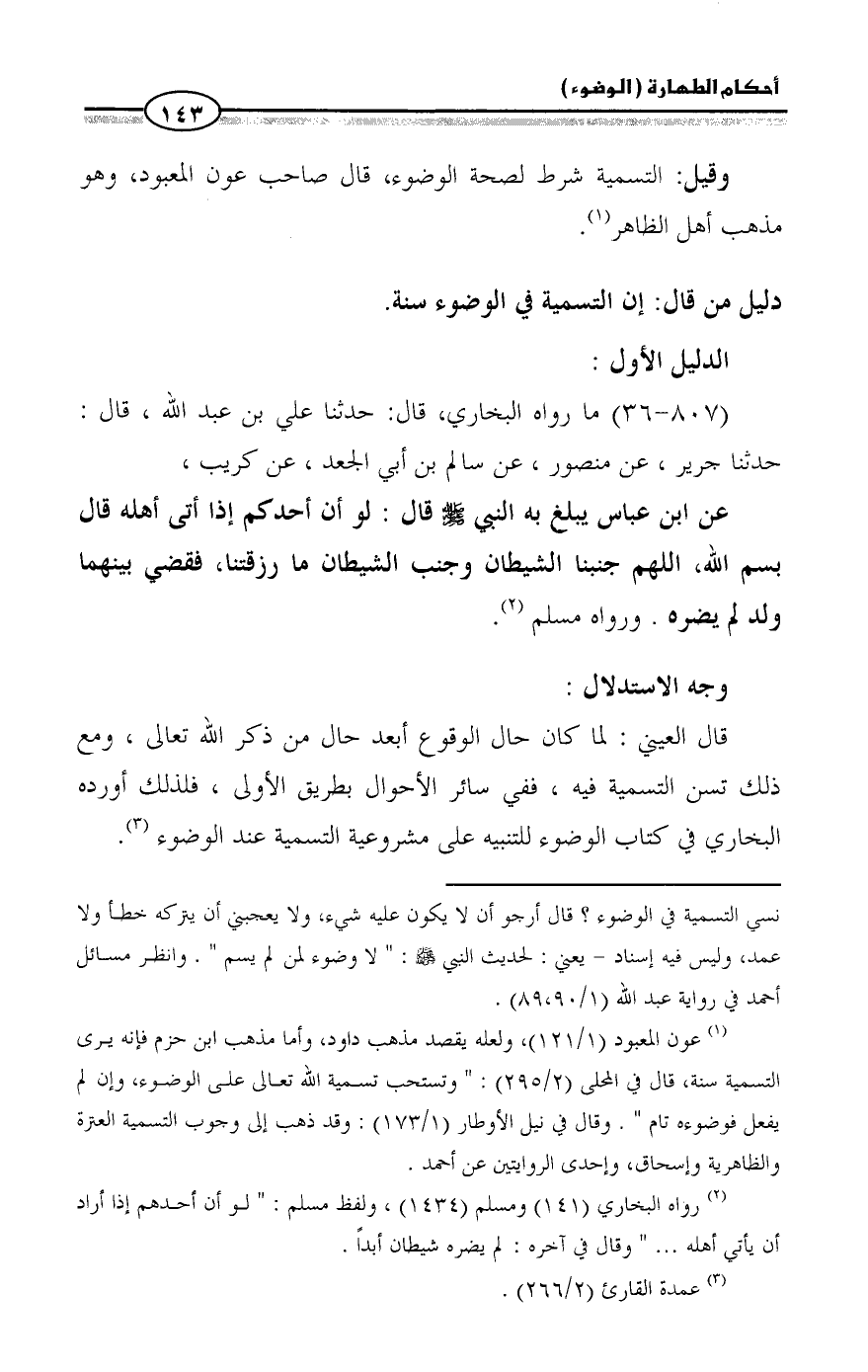 (¬١) عون المعبود (١/ ١٢١)، ولعله يقصد مذهب داود، وأما مذهب ابن حزم فإنه يرى التسمية سنة، قال في المحلى (٢/ ٢٩٥): " وتستحب تسمية الله تعالى على الوضوء، وإن لم يفعل فوضوءه تام ". وقال في نيل الأوطار (١/ ١٧٣): وقد ذهب إلى وجوب التسمية العترة والظاهرية وإسحاق، وإحدى الروايتين عن أحمد.