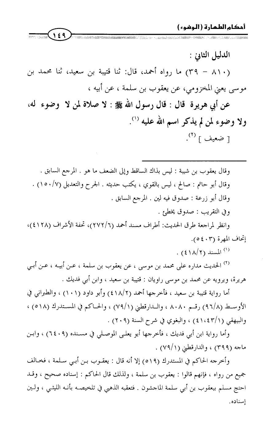 (٨١٠ - ٣٩) ما رواه أحمد، قال: ثنا قتيبة بن سعيد، ثنا محمد بن موسى يعني المخزومي، عن يعقوب بن سلمة، عن أبيه،
