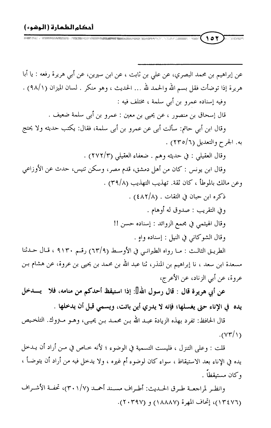 = عن إبراهيم بن محمد البصري، عن علي بن ثابت، عن ابن سيرين، عن أبي هريرة رفعه: يا أبا هريرة إذا توضأت فقل بسم الله والحمد لله ... الحديث، وهو منكر. لسان الميزان (١/ ٩٨).