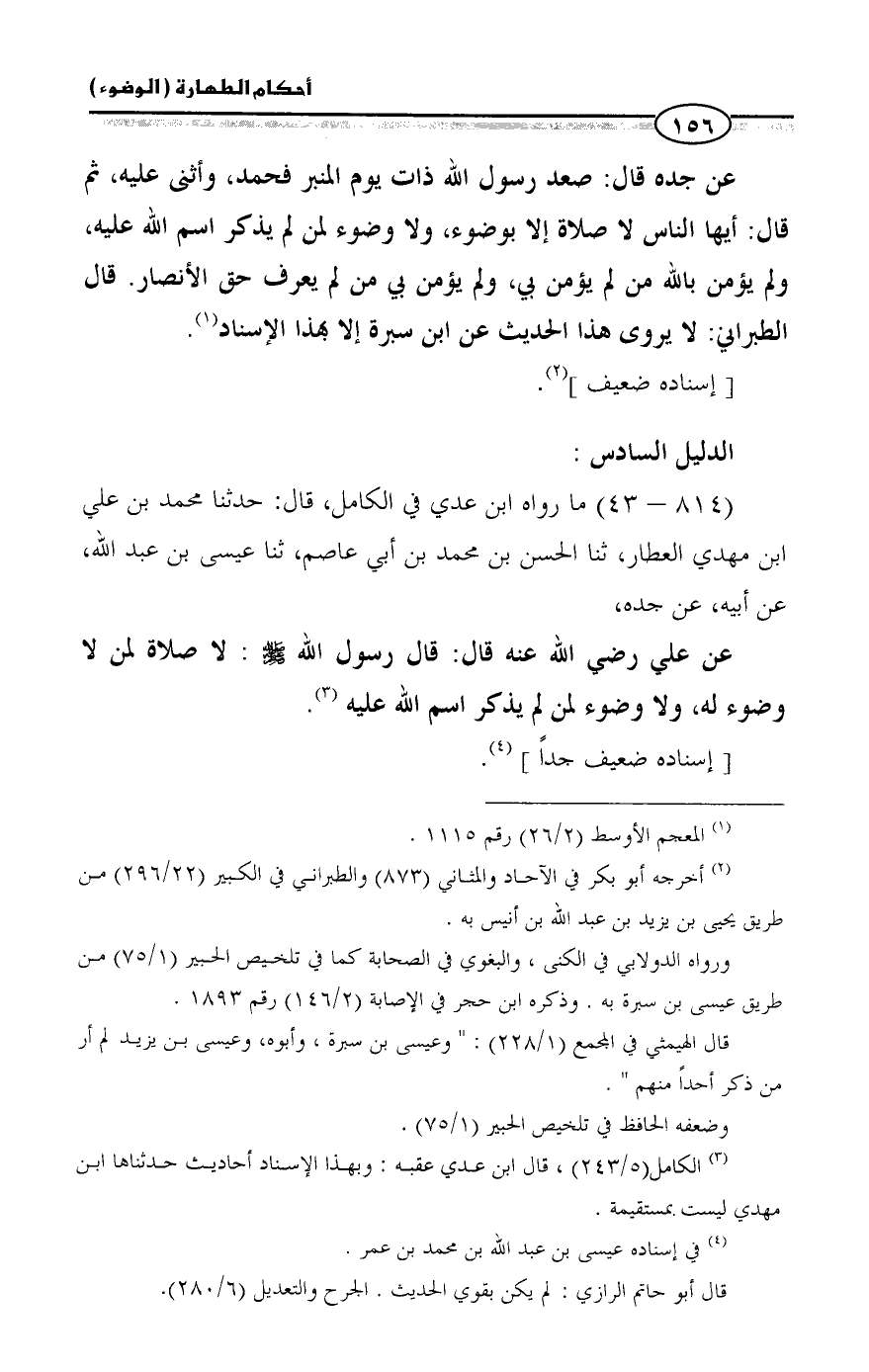 عن جده قال: صعد رسول الله ذات يوم المنبر فحمد، وأثنى عليه، ثم قال: أيها الناس لا صلاة إلا بوضوء، ولا وضوء لمن لم يذكر اسم الله عليه، ولم يؤمن بالله من لم يؤمن بي، ولم يؤمن بي من لم يعرف حق الأنصار. قال الطبراني: لا يروى هذا الحديث عن ابن سبرة إلا بهذا الإسناد (¬١).