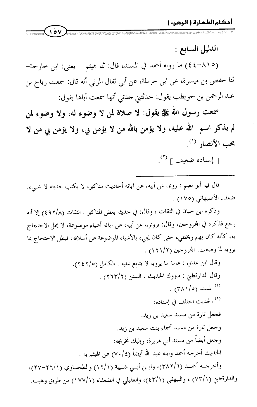 سمعت رسول الله - صلى الله عليه وسلم - يقول: لا صلاة لمن لا وضوء له، ولا وضوء لمن لم يذكر اسم الله عليه، ولا يؤمن بالله من لا يؤمن بي، ولا يؤمن بي من لا يحب الأنصار (¬١).