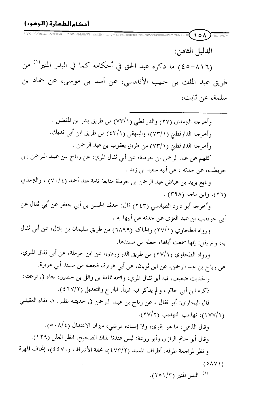 (٨١٦ - ٤٥) ما ذكره عبد الحق في أحكامه كما في البدر المنير (¬١) من طريق عبد الملك بن حبيب الأندلسي، عن أسد بن موسى، عن حماد بن سلمة، عن ثابت،