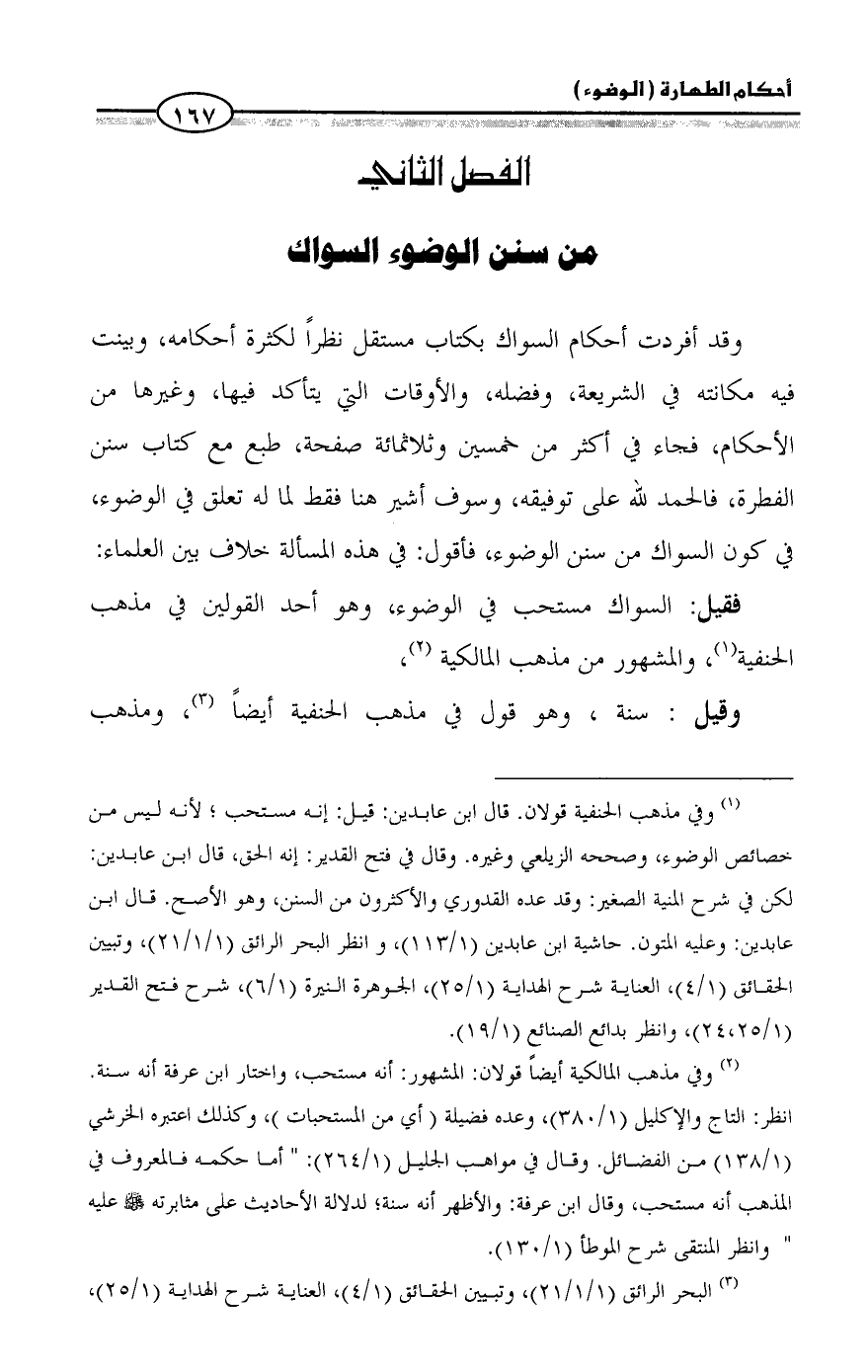 وقد أفردت أحكام السواك بكتاب مستقل نظراً لكثرة أحكامه، وبينت فيه مكانته في الشريعة، وفضله، والأوقات التي يتأكد فيها، وغيرها من الأحكام، فجاء في أكثر من خمسين وثلاثمائة صفحة، طبع مع كتاب سنن الفطرة، فالحمد لله على توفيقه، وسوف أشير هنا فقط لما له تعلق في الوضوء، في كون السواك من سنن الوضوء، فأقول: في هذه المسألة خلاف بين العلماء: