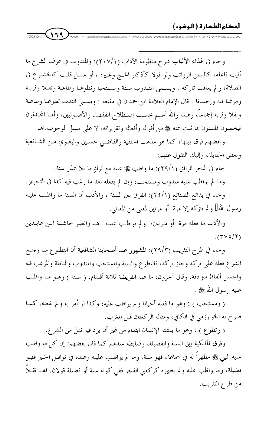 = وجاء في غذاء الألباب شرح منظومة الآداب (١/ ٢٠٧): والمندوب في عرف الشرع ما أثيب فاعله، كالسنن الرواتب ولو قولا كأذكار الحج وغيره , أو عمل قلب كالخشوع في الصلاة، ولم يعاقب تاركه. ويسمى المندوب سنة ومستحبا وتطوعا وطاعة ونفلا وقربة ومرغبا فيه وإحسانا. قال الإمام العلامة ابن حمدان في مقنعه: ويسمى الندب تطوعا وطاعة ونفلا وقربة إجماعاً، وهذا والله أعلم بحسب اصطلاح الفقهاء والأصوليين، وأما المحدثون فيخصون المسنون بما ثبت عنه - صلى الله عليه وسلم - من أقواله وأفعاله وتقريراته، لا على سبيل الوجوب. اهـ