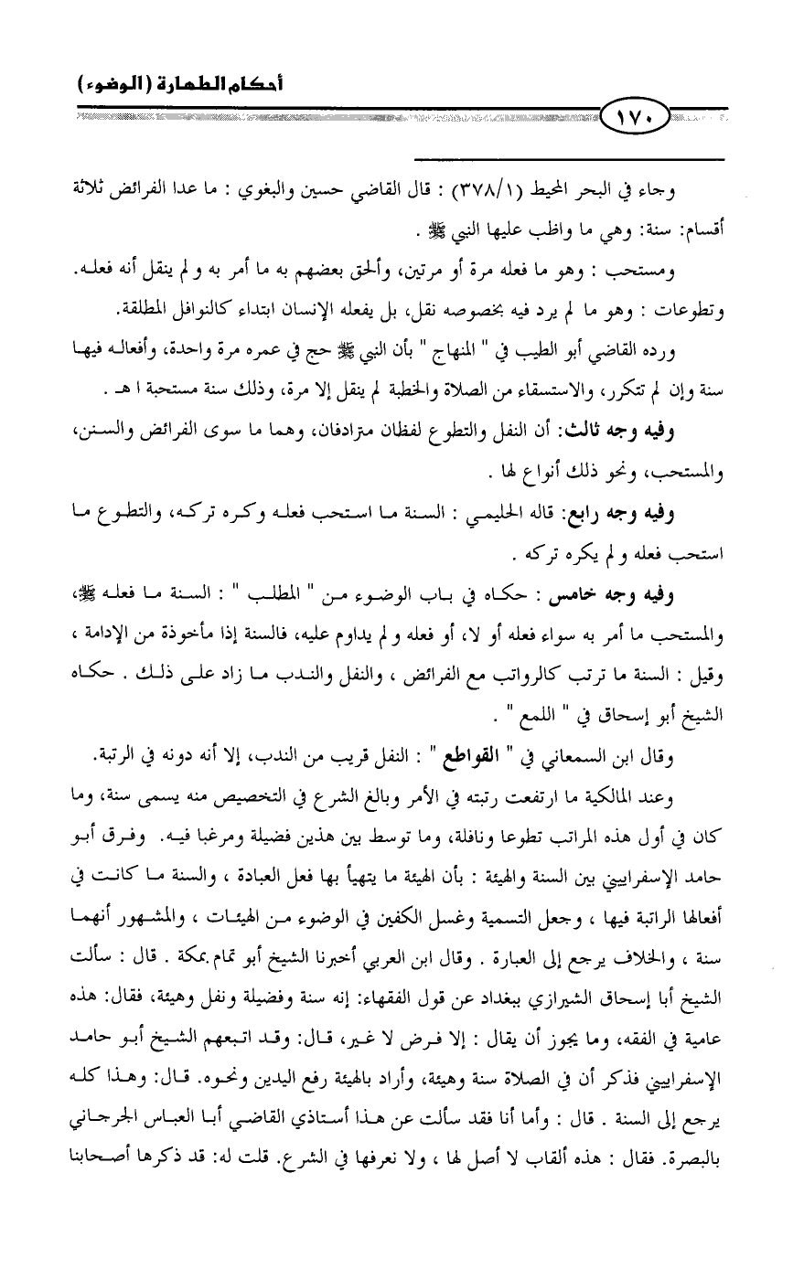= وجاء في البحر المحيط (١/ ٣٧٨): قال القاضي حسين والبغوي: ما عدا الفرائض ثلاثة أقسام: سنة: وهي ما واظب عليها النبي - صلى الله عليه وسلم -.